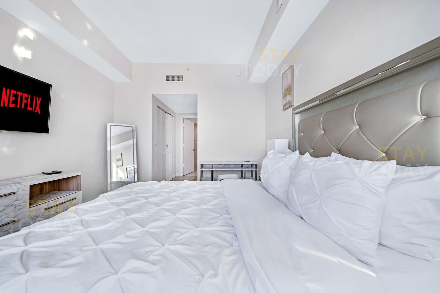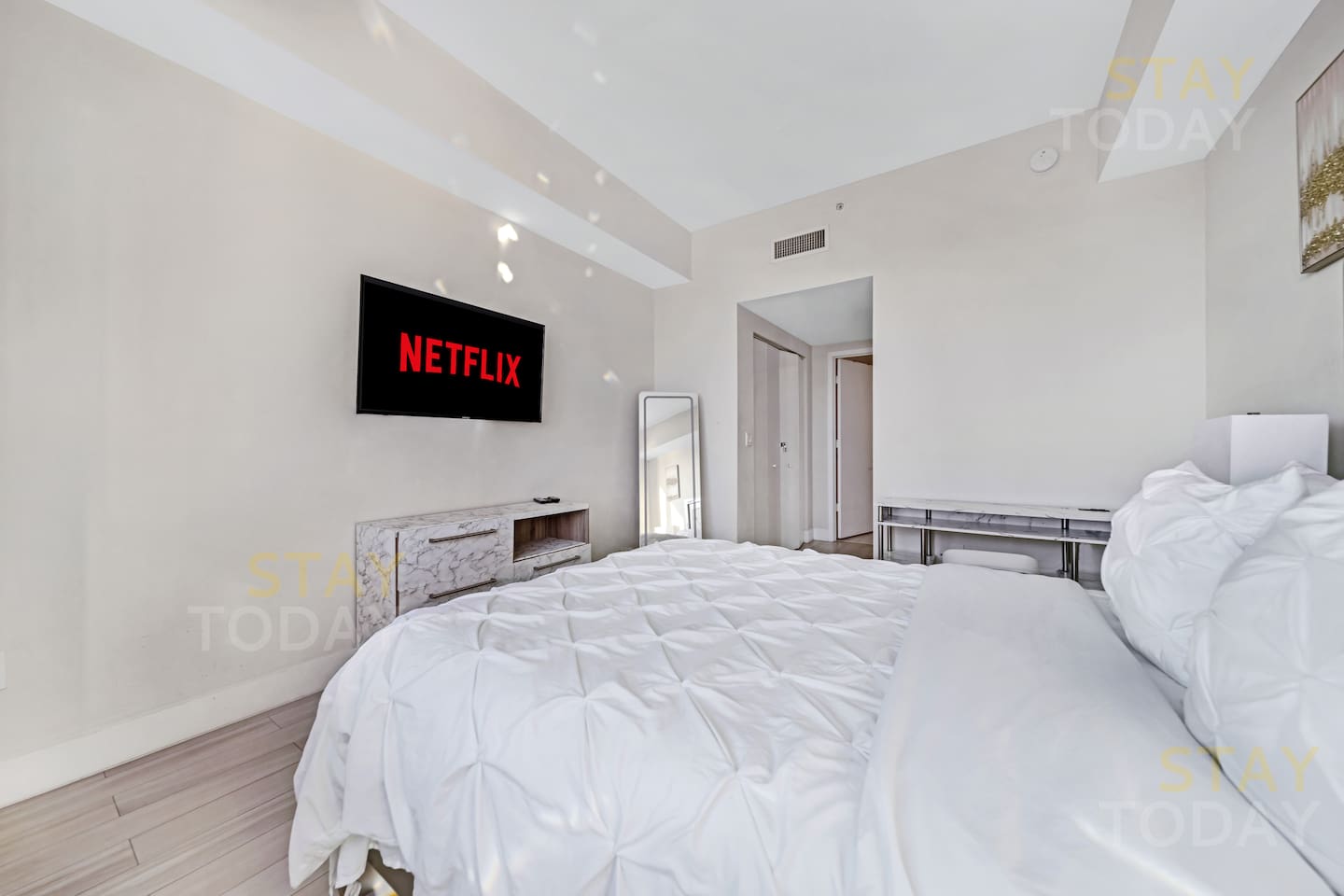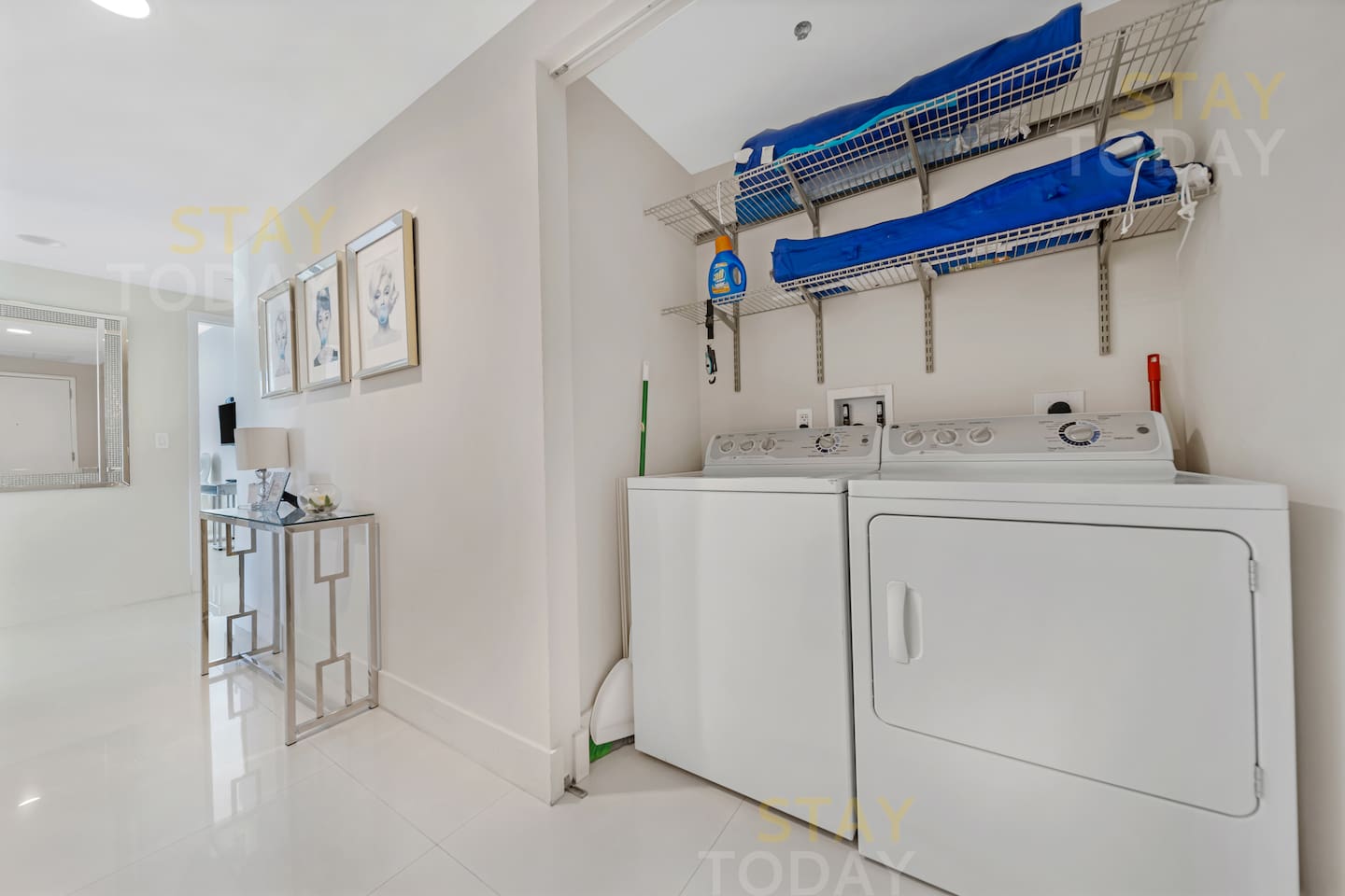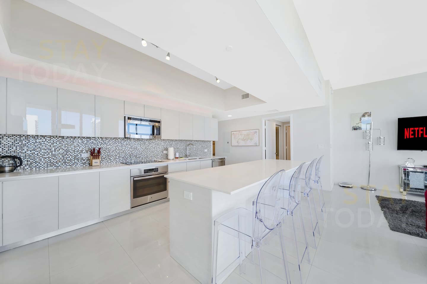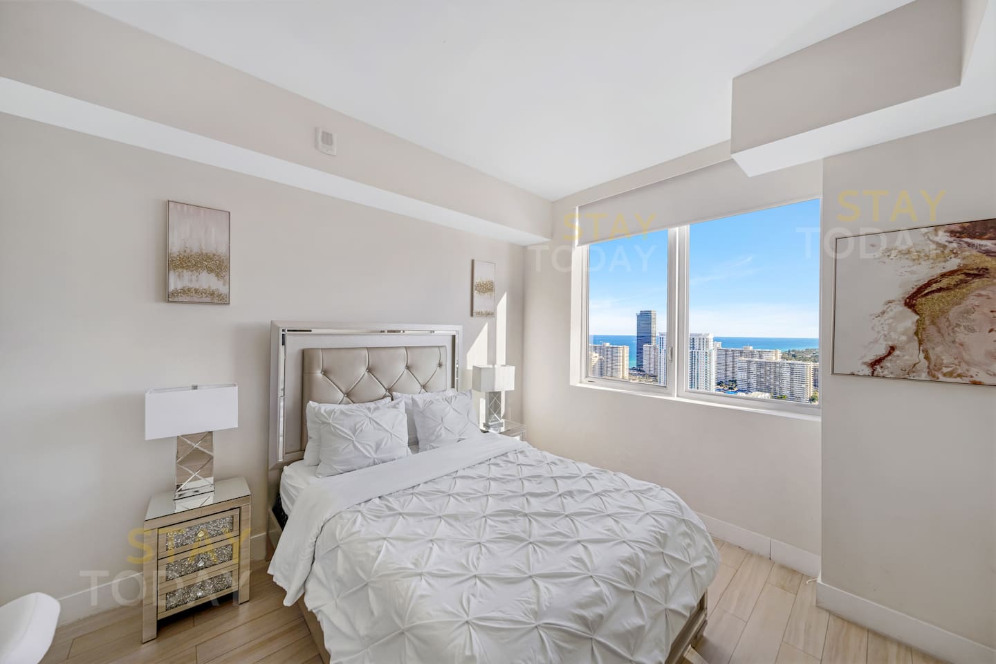 🍳 Kitchen: Enjoy a fully equipped, modern open-plan kitchen with stainless steel appliances, ocean views, and panoramic windows. Everything you need to cook and dine comfortably at home is provided. ⸻ 🪑 Dining Area: A stylish and comfortable area with a table for six, perfect for shared meals, game nights, or casual conversation, complemented by additional bar seating for four. ⸻ 🛋️Living Room: The living room offers a bright and inviting space with floor-to-ceiling windows that open onto a private balcony with ocean and city views. A plush seating area creates the perfect spot to relax with family or friends. The modern design and natural light give the room a stylish yet comfortable atmosphere, ideal for unwinding after a day at the beach or exploring the city. ⸻ 🛏️ First Bedroom(Intercostal/city, ocean-view): The master suite features a king-size memory foam bed with eco-friendly linens, breathtaking ocean views, a walk-in closet, and a private en-suite bathroom with a separate shower and tub. It includes a flat-screen TV and direct access to the balcony. ⸻ 🛏️ Second Bedroom(Intercostal/city, side ocean-view): This cozy room includes a queen-size bed, flat-screen TV, ample closet space, and ocean/Intracoastal views. It also has a private en-suite bathroom with a walk-in shower. ⸻ 🛏️ Third Bedroom(Intercostal/city, side ocean-view): Furnished with a queen-size bed, flat-screen TV, and a bathroom that also has access from the living area. Enjoy both ocean and Intracoastal views from this bedroom. ⸻ 🛁Master Bathroom: The master bathroom, located within the master bedroom, features a sleek modern design with a glass-enclosed walk-in shower and a separate soaking tub for ultimate relaxation. A spacious vanity with contemporary fixtures provides plenty of room for getting ready in comfort. Bright lighting and clean finishes create a spa-like atmosphere, making this bathroom both stylish and functional. ⸻ 🛁Second Bathroom: The second bathroom, located within the second bedroom, offers a sleek and modern design with a spacious walk-in glass shower. A wide vanity with a bright mirror and fresh towels provides both style and convenience. Its private setup ensures guests enjoy comfort and ease throughout their stay. ⸻ 🛁Third Bathroom: The third bathroom, located just in front of the third bedroom, features a modern design with a glass-enclosed shower and tub combination. A sleek vanity with a bright mirror and fresh towels provides comfort and convenience. Its thoughtful layout makes it easily accessible while maintaining a clean and stylish look. ⸻ 🧺 Washer/Dryer: For your convenience, a private washer and dryer are available in the unit - ideal for longer stays or beach-heavy days.