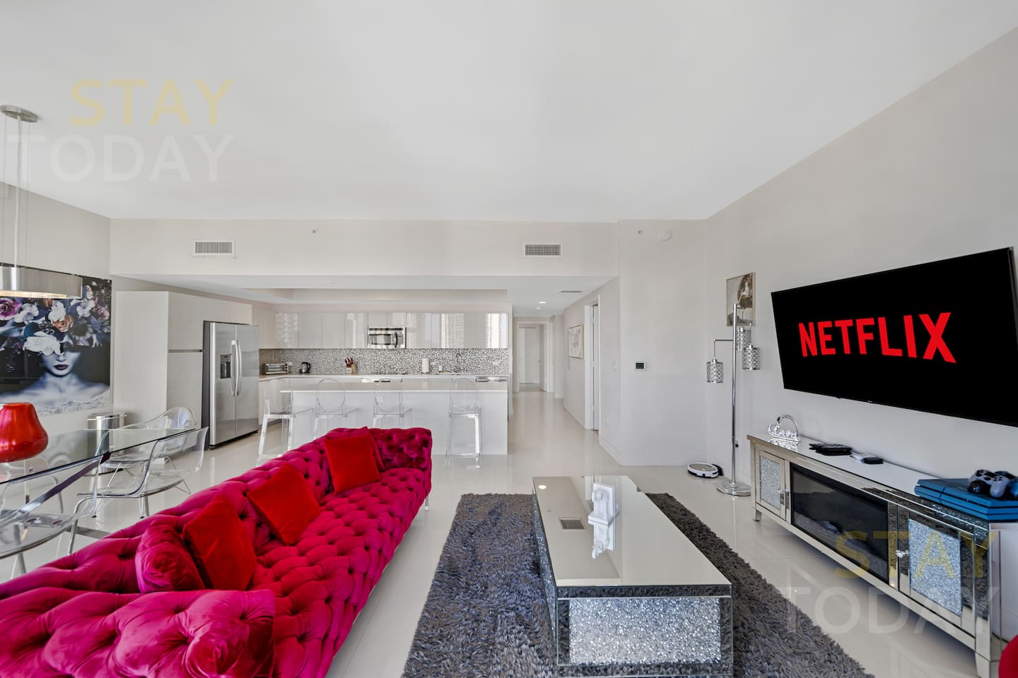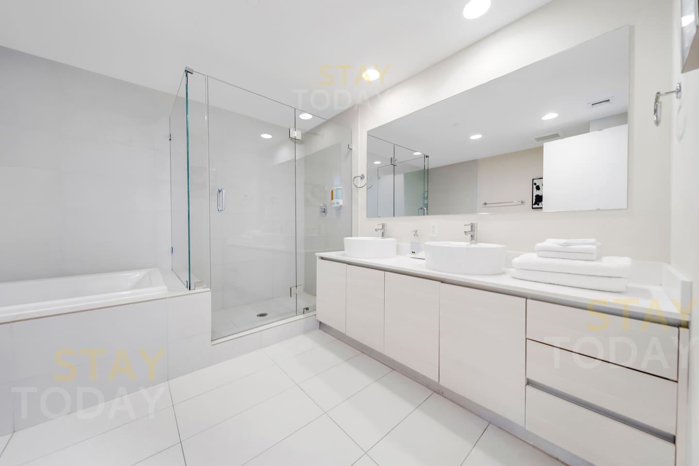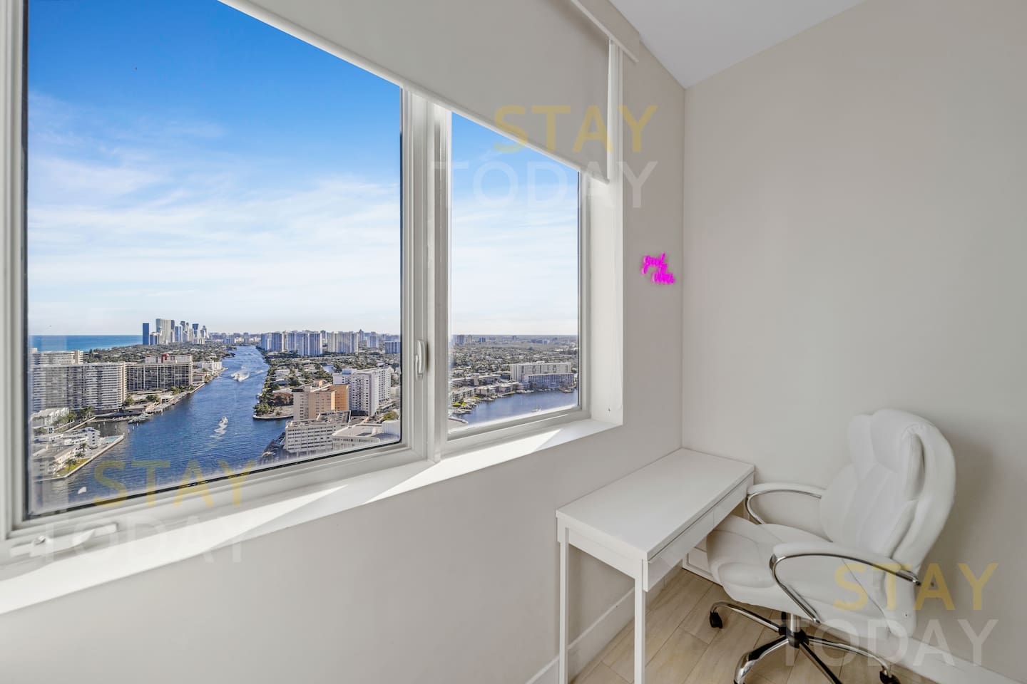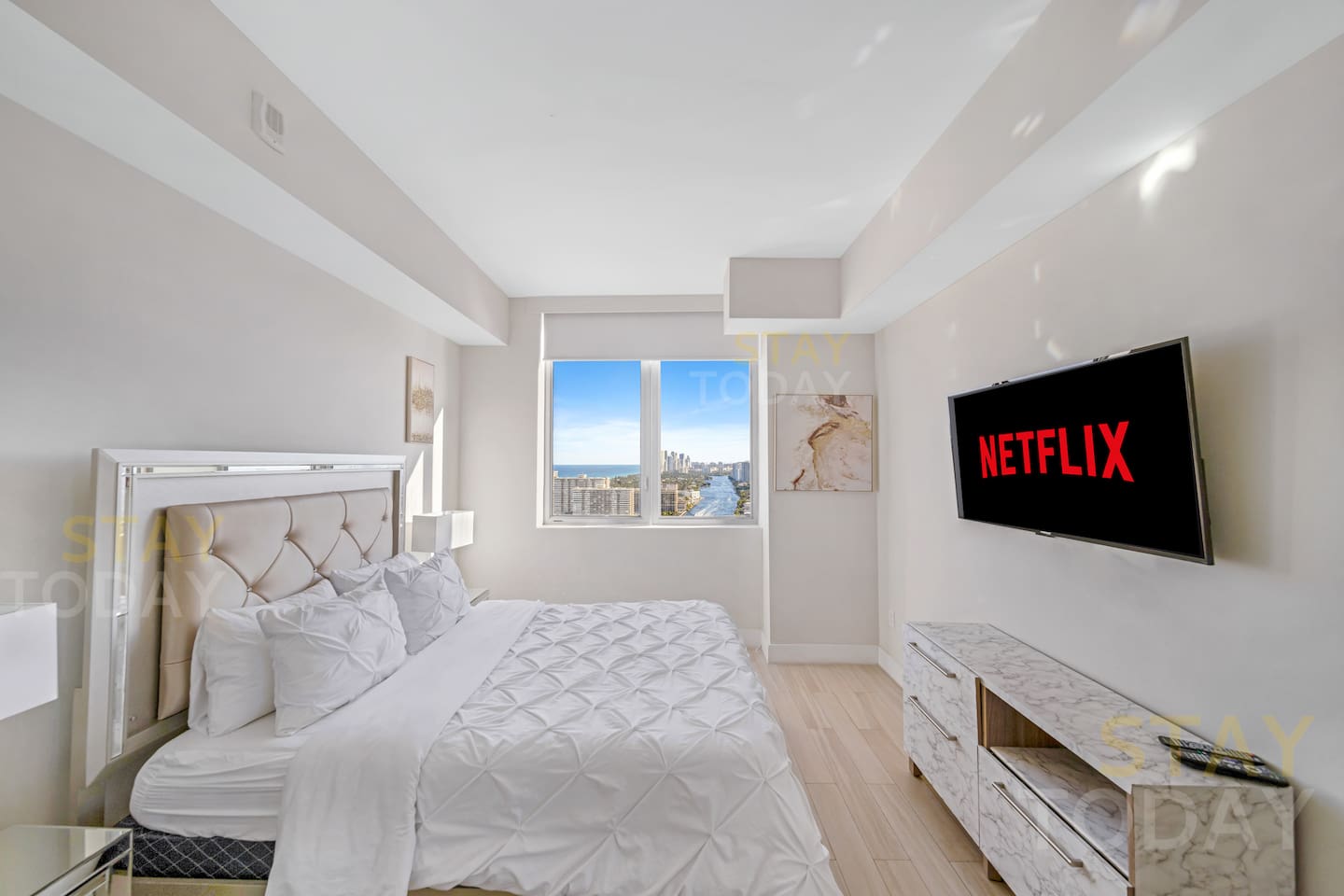 🍳 Kitchen: Enjoy a fully equipped, modern open-plan kitchen with stainless steel appliances, ocean views, and panoramic windows. Everything you need to cook and dine comfortably at home is provided. ⸻ 🪑 Dining Area: A stylish and comfortable area with a table for six, perfect for shared meals, game nights, or casual conversation, complemented by additional bar seating for four. ⸻ 🛋️Living Room: The living room offers a bright and inviting space with floor-to-ceiling windows that open onto a private balcony with ocean and city views. A plush seating area creates the perfect spot to relax with family or friends. The modern design and natural light give the room a stylish yet comfortable atmosphere, ideal for unwinding after a day at the beach or exploring the city. ⸻ 🛏️ First Bedroom(Intercostal/city, ocean-view): The master suite features a king-size memory foam bed with eco-friendly linens, breathtaking ocean views, a walk-in closet, and a private en-suite bathroom with a separate shower and tub. It includes a flat-screen TV and direct access to the balcony. ⸻ 🛏️ Second Bedroom(Intercostal/city, side ocean-view): This cozy room includes a queen-size bed, flat-screen TV, ample closet space, and ocean/Intracoastal views. It also has a private en-suite bathroom with a walk-in shower. ⸻ 🛏️ Third Bedroom(Intercostal/city, side ocean-view): Furnished with a queen-size bed, flat-screen TV, and a bathroom that also has access from the living area. Enjoy both ocean and Intracoastal views from this bedroom. ⸻ 🛁Master Bathroom: The master bathroom, located within the master bedroom, features a sleek modern design with a glass-enclosed walk-in shower and a separate soaking tub for ultimate relaxation. A spacious vanity with contemporary fixtures provides plenty of room for getting ready in comfort. Bright lighting and clean finishes create a spa-like atmosphere, making this bathroom both stylish and functional. ⸻ 🛁Second Bathroom: The second bathroom, located within the second bedroom, offers a sleek and modern design with a spacious walk-in glass shower. A wide vanity with a bright mirror and fresh towels provides both style and convenience. Its private setup ensures guests enjoy comfort and ease throughout their stay. ⸻ 🛁Third Bathroom: The third bathroom, located just in front of the third bedroom, features a modern design with a glass-enclosed shower and tub combination. A sleek vanity with a bright mirror and fresh towels provides comfort and convenience. Its thoughtful layout makes it easily accessible while maintaining a clean and stylish look. ⸻ 🧺 Washer/Dryer: For your convenience, a private washer and dryer are available in the unit - ideal for longer stays or beach-heavy days.