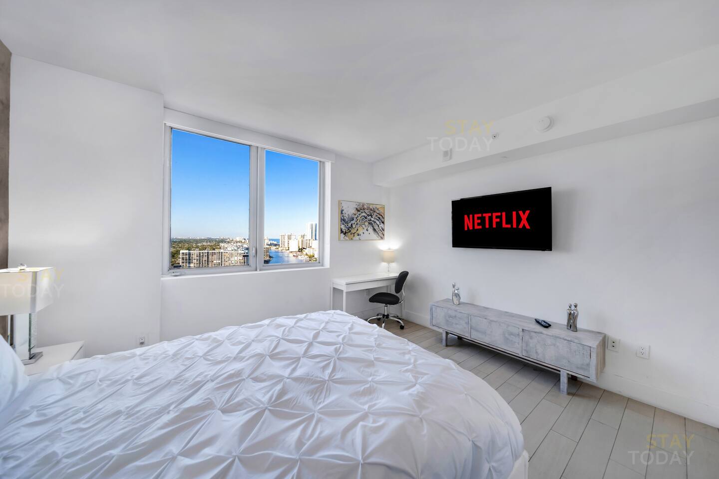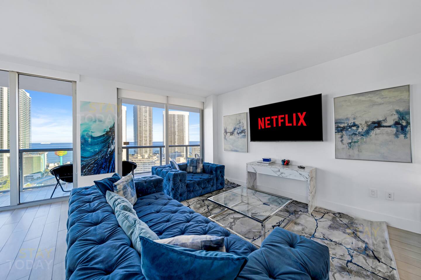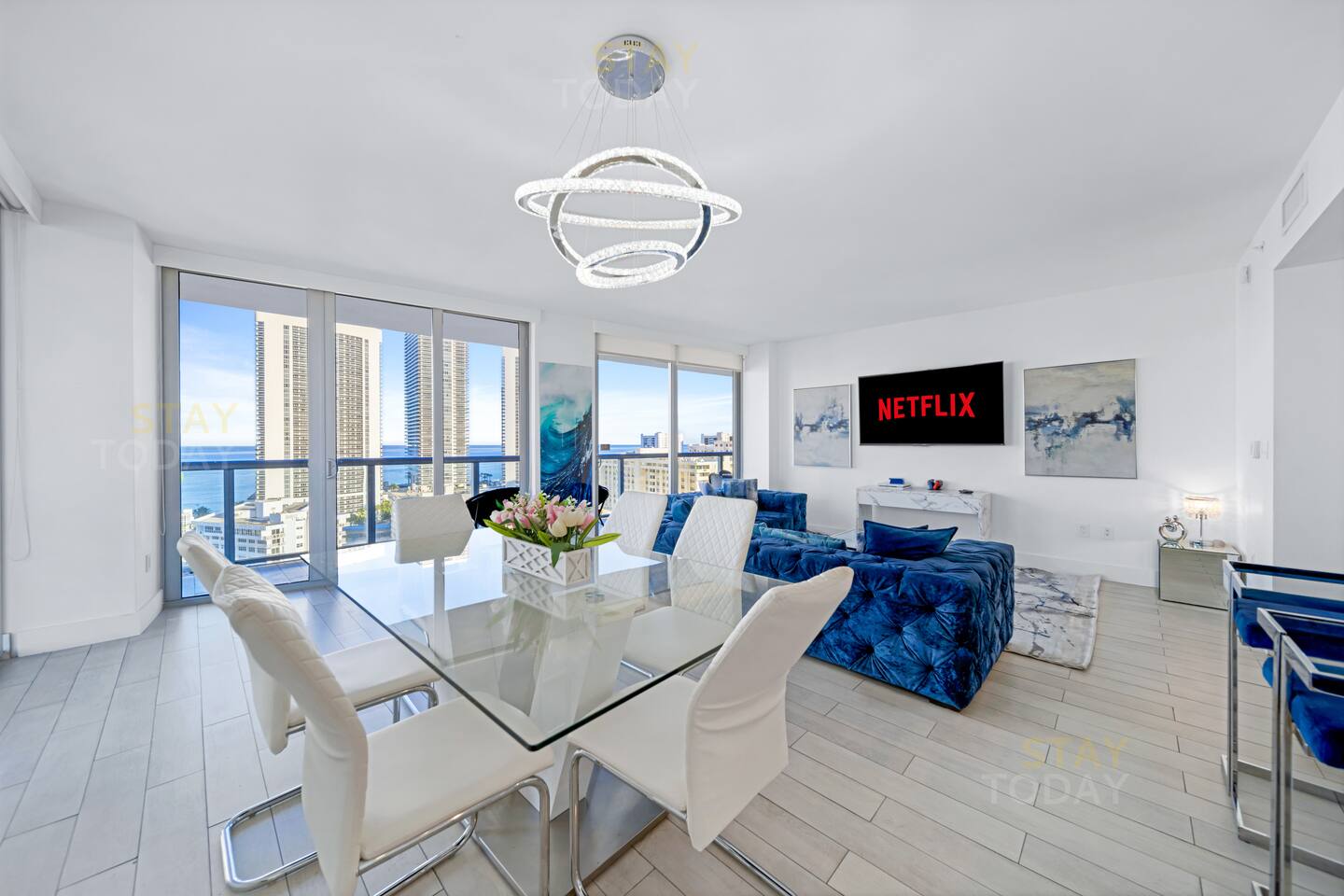 🏝️Beachwalk Resort offers a bespoke luxury experience in a casually elegant setting, with welcoming check-in staff, spectacular views, a fully equipped fitness center, and an infinity-edge waterfront pool that make every stay unforgettable. In this true 3-bedroom, 3-bath condo located in the VIP residents tower, a private keycard elevator opens directly to your foyer. The residence is styled with modern furnishings and includes a gourmet kitchen, WiFi, PlayStation, laundry, and full access to resort amenities such as the infinity pool, gym, beach service, and complimentary shuttle. ⸻ 🍳 Kitchen: Bright and contemporary kitchen designed for both style and function. Enjoy plenty of space to prepare meals, modern appliances, and an inviting layout that flows seamlessly into the dining area and living space. ⸻ 🥂Dining Area: The dining area has a table with six chairs, complemented by bar seating for three. After enjoying a delicious meal, you can relax on the couch with a Smart TV or simply take in the peaceful sunsets through the panoramic floor-to-ceiling windows. ⸻ 🛋️ Living Room: The main living room area is professionally designed to be tasteful as well as comfortable for your stay. The open plan kitchen has everything you will need for your stay. ⸻ 🛏️Master Bedroom (Direct ocean-view): The master bedroom has a king-sized bed with high-quality memory foam and eco-friendly linens, along with beautiful ocean views and direct access to the balcony. A spacious walk-in closet provides plenty of room for your belongings, and the en-suite bathroom includes both a separate shower and a tub for added convenience. ⸻ 🛏️Second Bedroom (Intercostal/city, side ocean-view): The 2nd bedroom has a queen size bed and bay/city view. Plenty of closet space and an in suite full bathroom with shower and bathtub make this room just as desirable as the master. ⸻ 🛏️Third Bedroom (Intercostal/city, side ocean-view): The third bedroom has a queen-size bed, wall-mounted Smart TV, work desk, and spacious closet, perfect for relaxing during your stay. It also comes with a dedicated bathroom conveniently accessible from the living room. ⸻ 🛁Master Bathroom: The master bathroom offers a luxurious retreat with a sleek double vanity, a glass-enclosed walk-in shower, and a separate soaking tub. Bright lighting and modern finishes create a spa-like atmosphere, perfectly complementing the comfort of the master bedroom. ⸻ 🛁Second Bathroom: The second bathroom, located inside the second bedroom, features a clean and modern design with a full bathtub-shower combo, stylish vanity, and bright lighting. Its private, in-room access ensures comfort and convenience for a more exclusive stay. ⸻ 🛁Third Bathroom: The third bathroom, dedicated to the third bedroom yet conveniently accessible from the living room, features a sleek glass-enclosed shower, modern vanity, and bright lighting. Its thoughtful design offers both style and practicality for everyday comfort. ⸻ 🧺 Washer/Dryer: In-unit washer and dryer available for your convenience. ⸻ 🌅 Balcony: The expansive private balcony offers unobstructed views of the Intracoastal Waterway, city skyline, and Atlantic Ocean. Perfect for morning coffee or evening relaxation, it provides a unique vantage point to enjoy both sunrise and sunset.