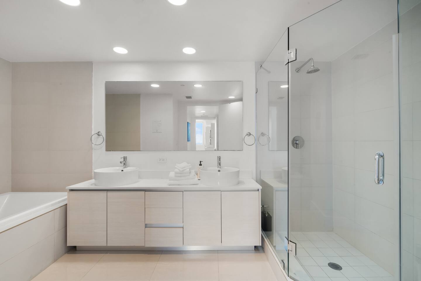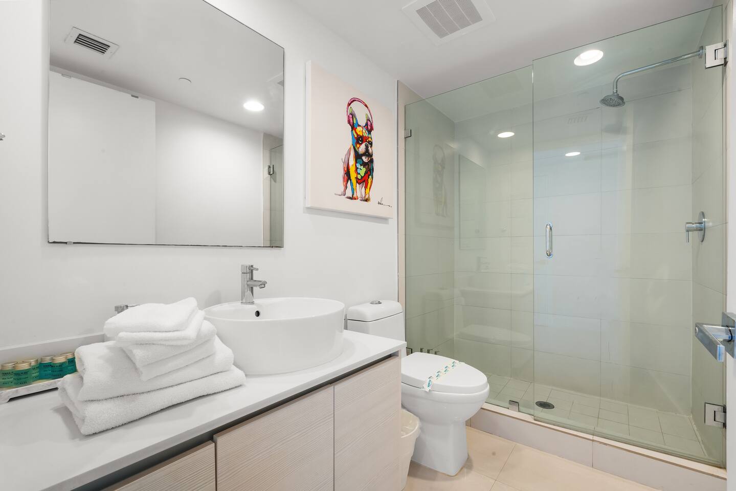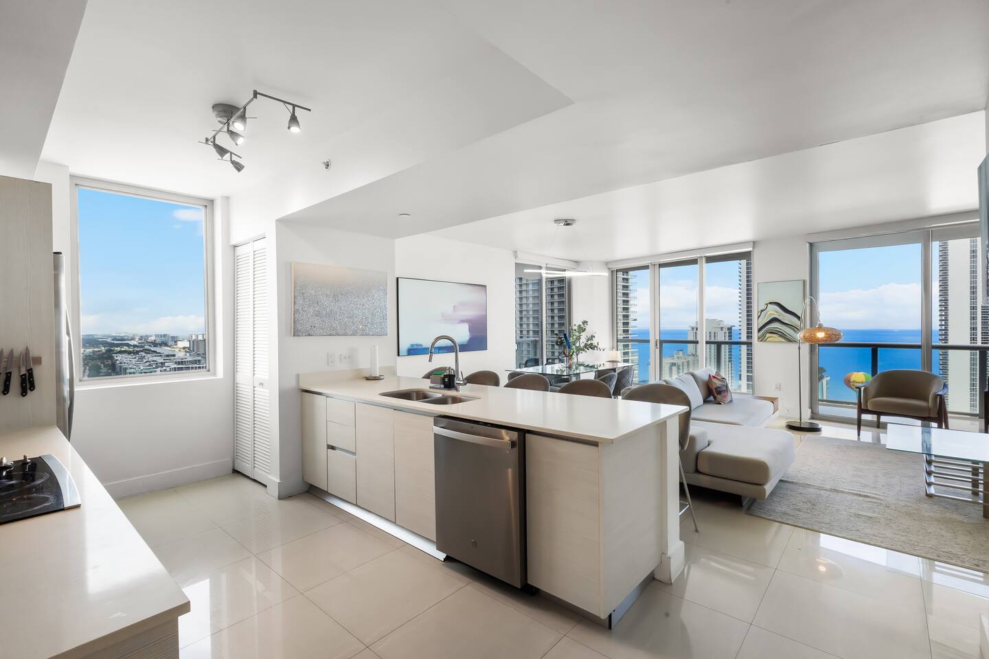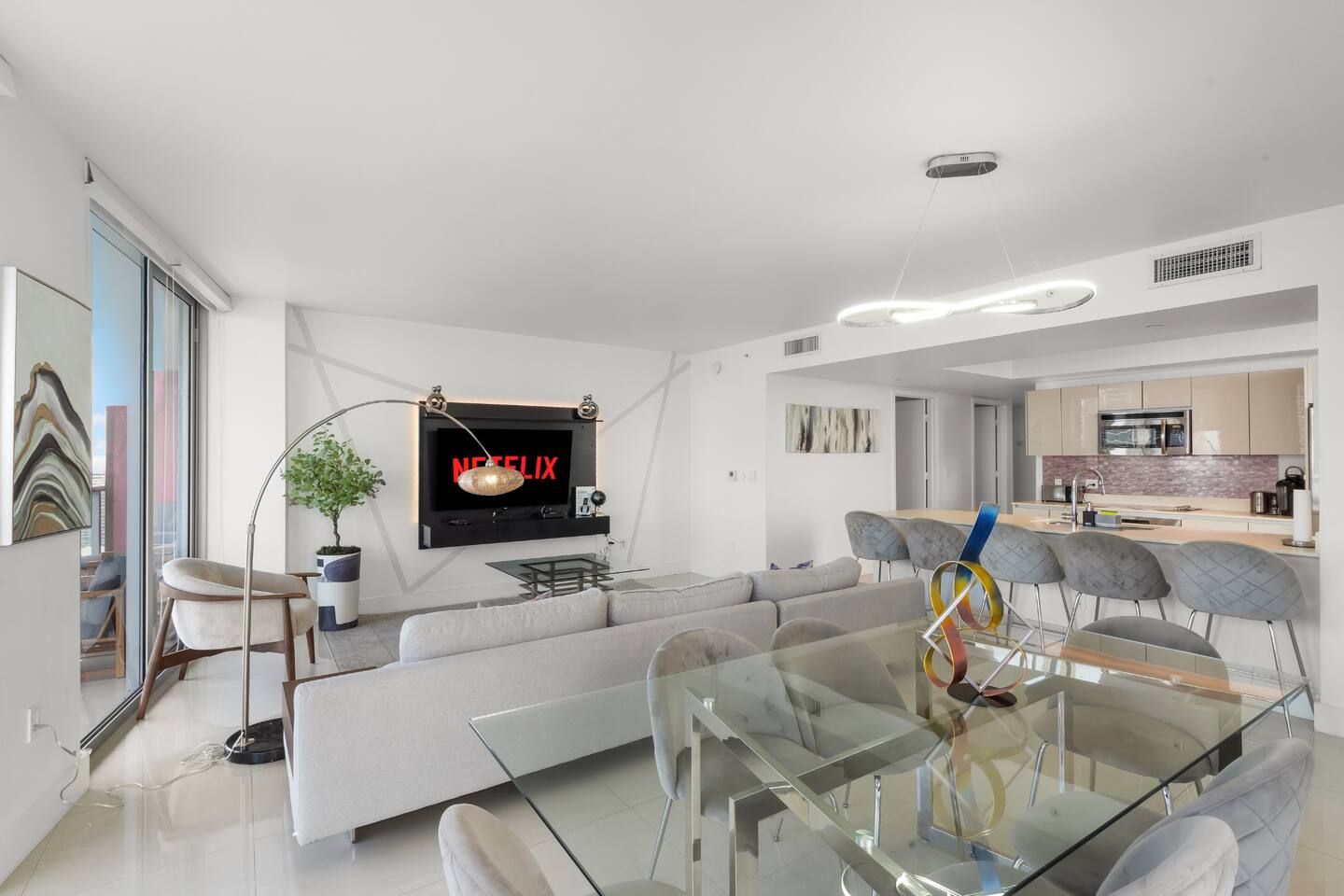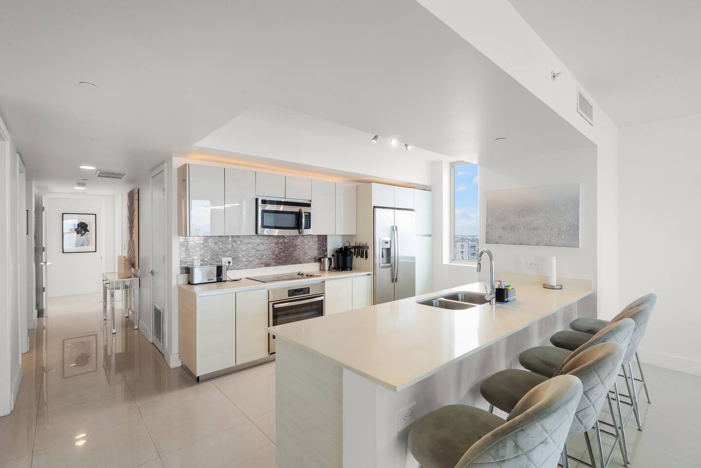 🏝️Revel in Miami sunshine at the exclusive and luxury building with resort amenities including gym, pool and beach service and complimentary beach shuttle. This apartment is great for couples, solo adventurers, business travelers, families (with kids), and big groups. ⸻ 🍳Kitchen: The kitchen offers a bright and modern space with sleek finishes, quality appliances, and ample counter space, perfect for preparing meals and spending time together. ⸻ 🥂Dining area: The dining area offers a bright and inviting setting with seating for six, where stunning views become the backdrop for every meal. It also features bar seating for two, creating the perfect atmosphere to gather, share, and enjoy time together. ⸻ 🛋️Living Area: The main living space is professionally designed to be tasteful as well as comfortable for your stay. The open plan kitchen has everything you will need for your stay. From the kitchen island you look out to the living room/dinning are as well as beautiful views through panoramic floor to ceiling windows. The dining area has a table and six chairs. The dining area leads into the living area which has a comfortable couch along with a Smart TV that is perfect after a long day at the beach. ⸻ 🛏️Master Bedroom (Ocean-View): The master bedroom has a king-sized bed with high-quality memory foam and eco-friendly linens, along with beautiful ocean views and private balcony access. A spacious walk-in closet provides plenty of room for your belongings, and the en-suite bathroom features both a separate shower and a tub for added convenience. This bedroom also includes a flat-screen smart TV. ⸻ 🛏️Second Bedroom (Intercostal/city, side Ocean-View): The second bedroom features two comfortable twin-size beds with elegant tufted headboards, a spacious closet, and a flat-screen smart TV for your entertainment. Enjoy the added convenience of a private in-room bathroom, offering both comfort and privacy. ⸻ 🛏️Third Bedroom (Intercostal/city, side Ocean-View): The third bedroom has a queen-size bed and bay/city view, along with a flat-screen smart TV and plenty of closet space. A dedicated full bathroom with shower is located right in front of the bedroom, accessible from the living room for added convenience. ⸻ 🛁Master Bathroom: The master bathroom in the master bedroom offers a luxurious retreat with a spacious layout, double vanity sinks, a glass-enclosed rainfall shower, and a separate deep soaking tub. Modern finishes and bright lighting create a serene, spa-like atmosphere for ultimate comfort. ⸻ 🛁Second Bathroom: The second bathroom, located in the second bedroom, offers a bright and functional space with a modern vanity, large mirror, and a combination bathtub and shower. Fresh towels and contemporary finishes make it a comfortable and convenient private retreat. ⸻ 🛁Third Bathroom: The third bathroom, located just in front of the third bedroom and accessible from the living room, features a modern glass-enclosed shower, stylish vanity, and bright lighting. Its fresh, contemporary design makes it both functional and inviting for guests. ⸻ 🧺 Washer/Dryer: In-unit washer and dryer available for your convenience. ⸻ 🌅Balcony: The balcony invites you to unwind while taking in sweeping city and ocean views, creating the perfect spot to relax, sip your favorite drink, and enjoy the fresh coastal breeze.