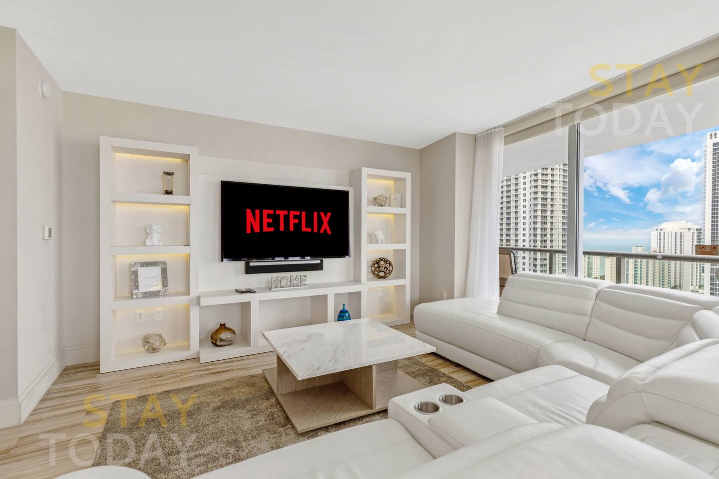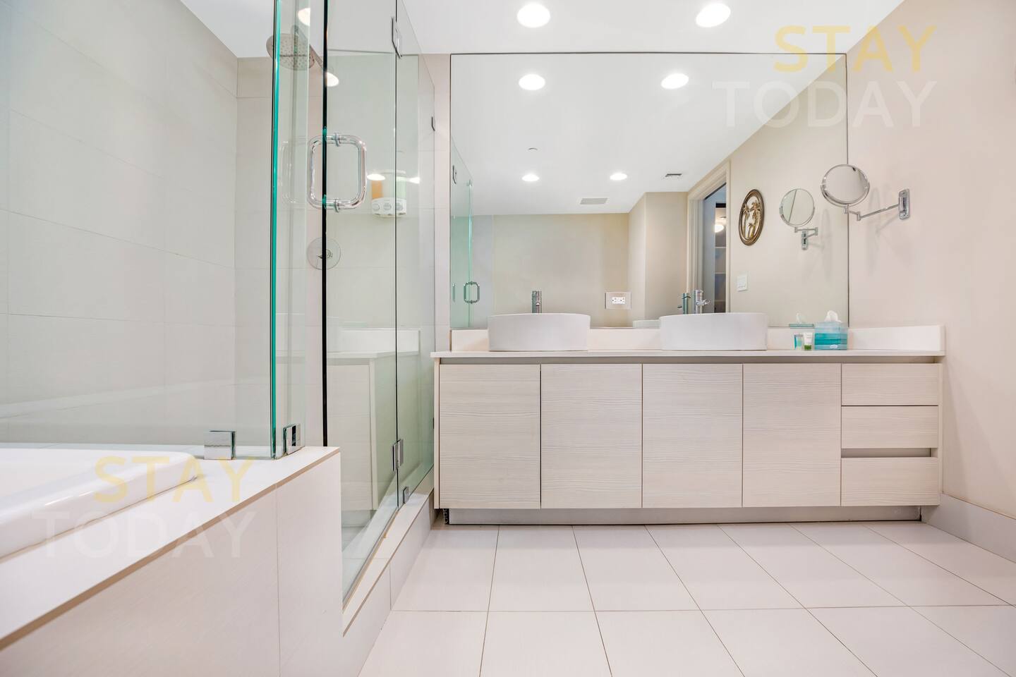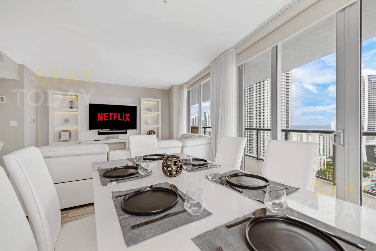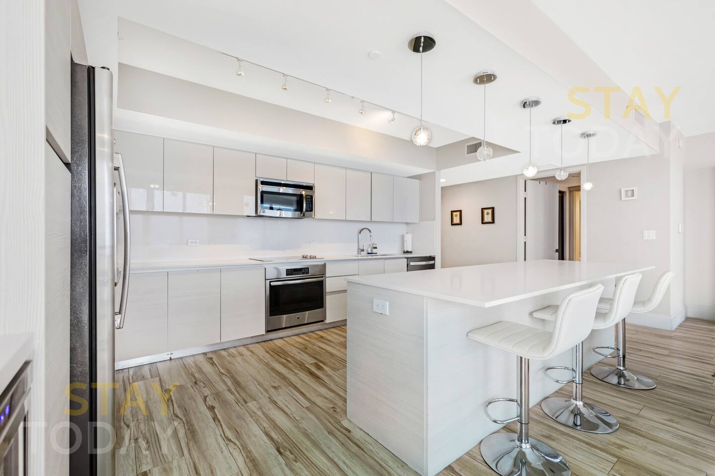 🍳 Kitchen: Cook and dine in style in the fully equipped, gourmet kitchen featuring European cabinetry, stainless steel appliances, and floor-to-ceiling windows with breathtaking water views. The kitchen island flows into the open-concept living and dining area, perfect for entertaining. ⸻ 🪑 Dining Area: A dedicated space with a table and seating for six, additional bar seating at the kitchen island for three. Ideal for meals, games, or conversation after a day in the sun. ⸻ 🛋️ Living Room: The living room offers a bright and inviting space with floor-to-ceiling windows framing stunning ocean and city views. A large sectional couch provides plenty of seating for relaxing with family or friends. The flat-screen TV with streaming options, including Netflix, makes it easy to enjoy movie nights or unwind after a day at the beach. With its open design, the space flows naturally into the dining area and kitchen, creating the perfect setting for gathering and entertaining. ⸻ 🛏️ First Bedroom (Intercostal/city, Ocean-View): The master suite includes a king-size memory foam bed with eco-friendly linens, direct ocean views, a walk-in closet, and a private en-suite bathroom with separate shower and tub. Enjoy direct access to the balcony with panoramic views of the ocean, city, and Intracoastal. ⸻ 🛏️ Second Bedroom(Intercostal/city, side Ocean-View): Furnished with a comfortable queen-size bed, this bedroom offers a relaxing space to unwind. It features a private en-suite bathroom and large windows that provide beautiful side ocean views along with a direct view of the city skyline. ⸻ 🛏️ Third Bedroom(Intercostal/city, side Ocean-View): This room features two twin-size beds and generous closet space. Large windows provide side ocean views, along with direct views of the city and Intracoastal Waterway. The third bathroom, which includes a bathtub, is accessible from this room as well as from the living area, offering added convenience for all guests. ⸻ 🛁Master Bathroom: The master bathroom offers a spa-like retreat with a sleek glass-enclosed shower and a deep soaking tub for ultimate relaxation. A wide vanity with dual sinks provides ample space for getting ready with ease. Bright lighting and modern finishes add to the clean, elegant design. Conveniently located in the master bedroom, this bathroom combines comfort and style in one private space. ⸻ 🛁Second Bathroom: The second bathroom, located within the second bedroom, offers modern finishes and a bright, clean design. A spacious glass-enclosed shower provides a refreshing place to unwind. The sleek vanity with ample counter space makes it easy to get ready for the day. With its private setup, this bathroom ensures convenience and comfort for guests staying in the second bedroom. ⸻ 🛁Third Bathroom: The third bathroom is conveniently located off the living room and serves the third bedroom. It features a modern vanity with a wide mirror, a clean and bright design, and a combination bathtub and shower for added flexibility. Thoughtful touches and contemporary finishes make it both stylish and practical. Its central location ensures comfort and easy access for guests. ⸻ 🧺 Washer/Dryer: A private washer and dryer are located in the unit. Great for longer stays or after time at the beach. ⸻