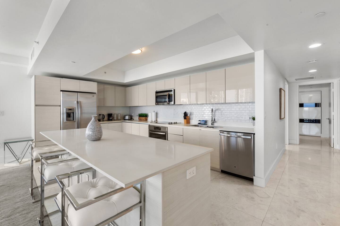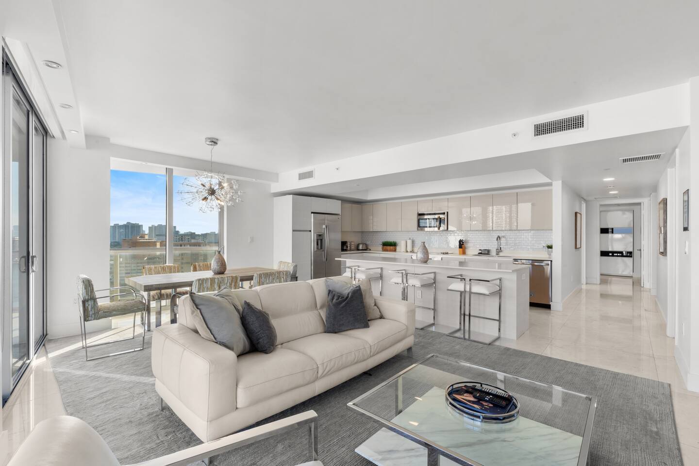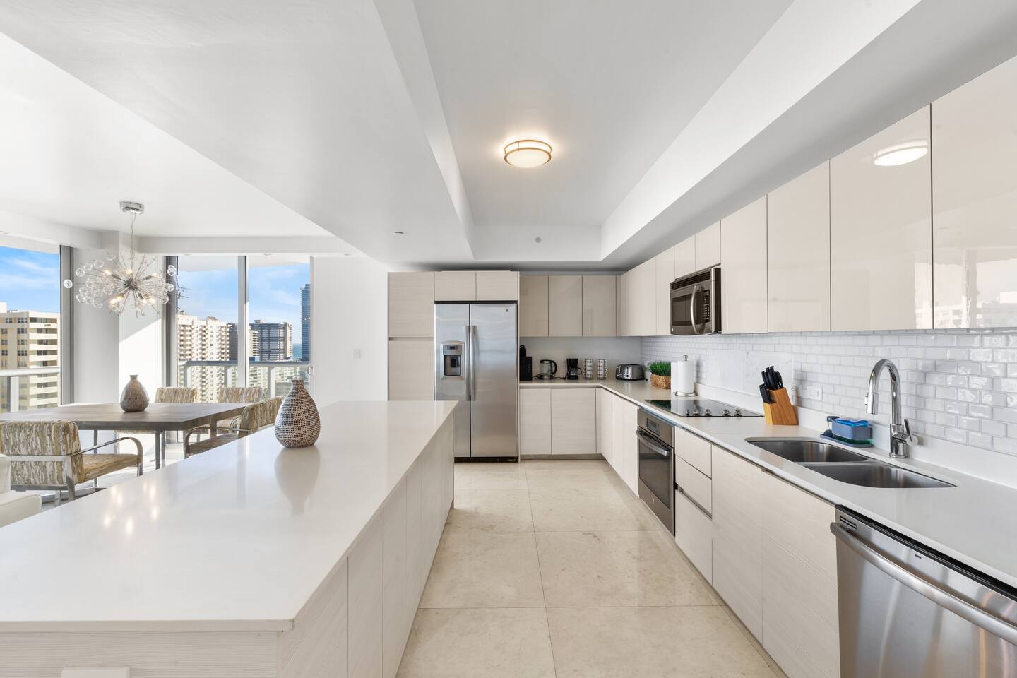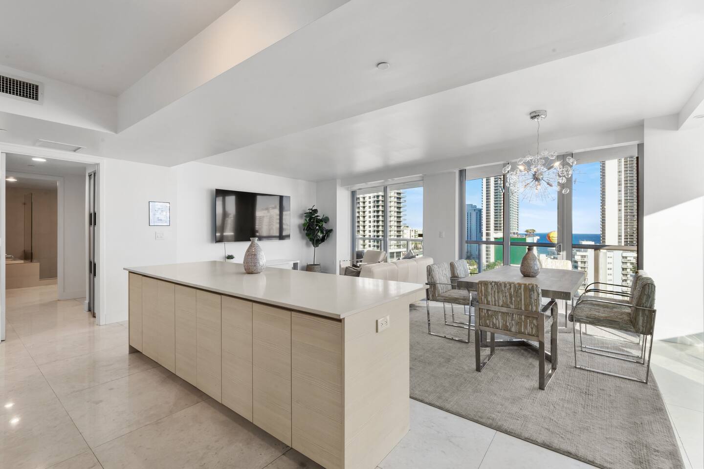 ⸻ 🍳 Kitchen The kitchen boasts a sleek, modern design with high-end stainless steel appliances, ample counter space, and a large island perfect for meal prep or casual dining. Fully equipped for all your cooking needs, it’s ideal for everything from quick snacks to full dinners. ⸻ 🥂Dining Area The dining area offers a stylish setting with a modern chandelier and seating for six, surrounded by floor-to-ceiling windows. It also includes bar seating for three, allowing you to enjoy meals with breathtaking views of the ocean, Intracoastal, and city skyline for a memorable dining experience any time of day. ⸻ 🛋️ Living Room Stylish open-concept living area with modern furnishings, plush seating, and floor-to-ceiling windows offering stunning water views. Flows into the dining area and a fully equipped kitchen with sleek, state-of-the-art appliances. ⸻ 🛏️Master Bedroom Unwind in the master suite, a spacious and tranquil haven featuring a luxurious king-sized bed with premium linens and direct access to the balcony. Floor-to-ceiling windows fill the room with natural light and offer stunning views, while the in-room master bathroom adds privacy and convenience, making this the perfect retreat after a day of adventure. ⸻ 🛏️ Second Bedroom The second bedroom offers a cozy and stylish escape with a comfortable queen-sized bed, ample storage, and a large window that invites in natural light. It features an in-room bathroom for added privacy and convenience, making it perfect for guests or family members seeking a restful night’s sleep. ⸻ 🛏️Third Bedroom Designed for flexibility and comfort, the third bedroom features two single beds, making it perfect for children, extra guests, or group travelers. Bright and inviting, it offers large windows with scenic views and a refreshing atmosphere, along with a dedicated bathroom that can be easily accessed from the living room. ⸻ 🛁Master Bathroom The master bathroom is a private en-suite retreat featuring a walk-in shower, relaxing bathtub, and dual sinks for added convenience. Bright lighting, a large mirror, and fresh towels complete this modern, elegant space designed for ultimate comfort. ⸻ 🛁Second Bathroom The second bathroom, located within the second bedroom, blends comfort and convenience with its clean, modern design. It offers a walk-in shower, fresh towels, and essential toiletries, creating a private space for guests to refresh and unwind during their stay. ⸻ 🛁Third Bathroom The third bathroom, accessible from the living room, offers convenience with its modern design. It features a shower-tub combo, fresh towels, and essential toiletries, creating a comfortable space for guests to refresh and unwind. ⸻ 🌅 Balcony Step onto your private balcony and take in panoramic ocean and city views. Whether sipping morning coffee or unwinding in the evening, this outdoor retreat offers a serene setting to enjoy the beauty of your surroundings. ⸻ 🧺 Washer/Dryer In-unit washer and dryer available for your convenience.
