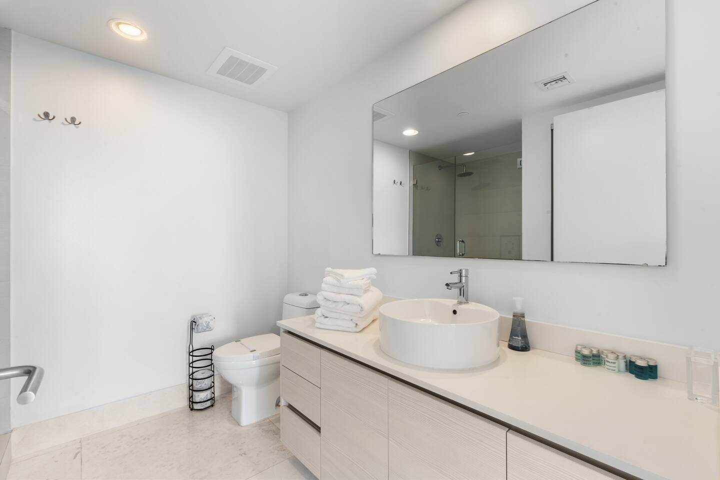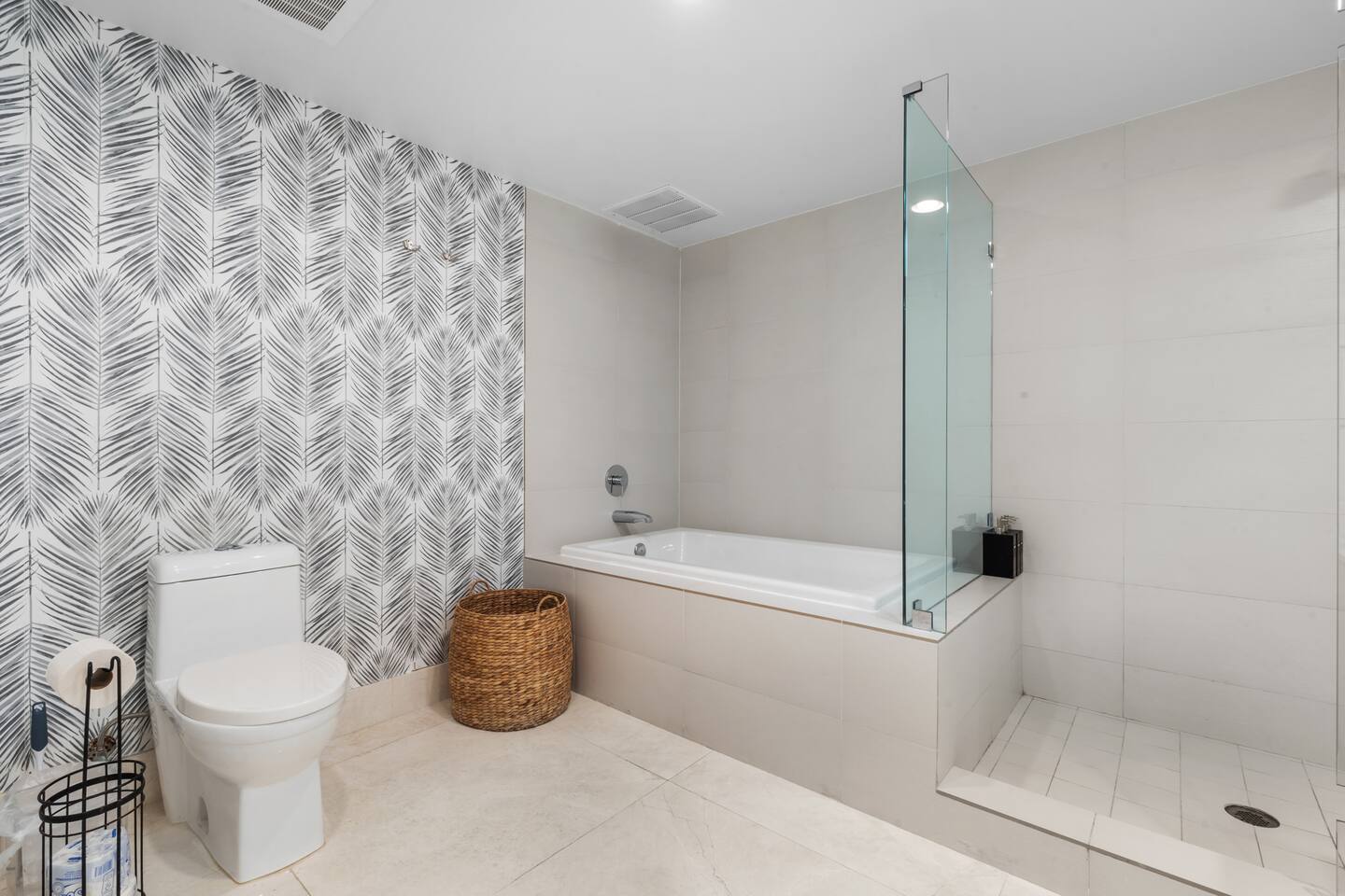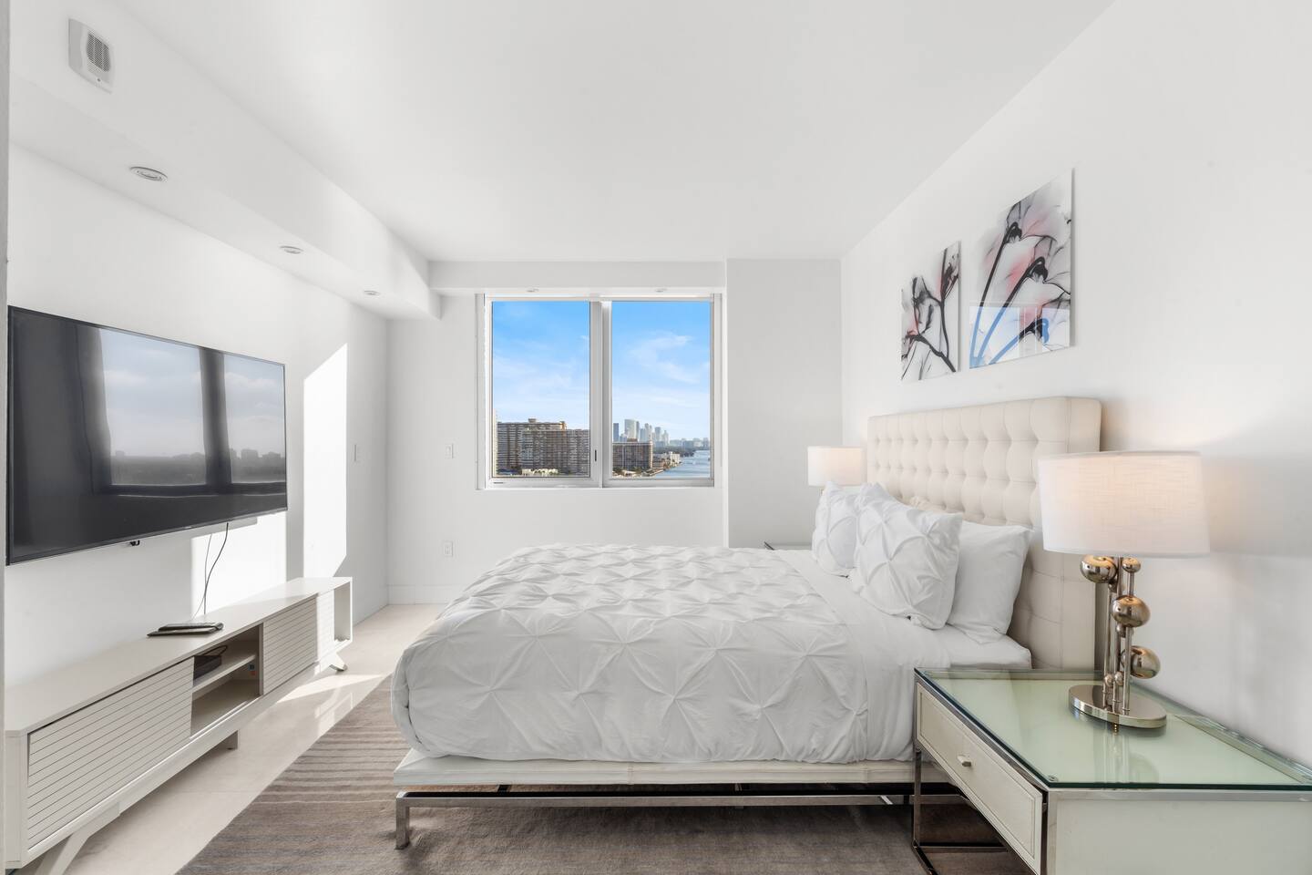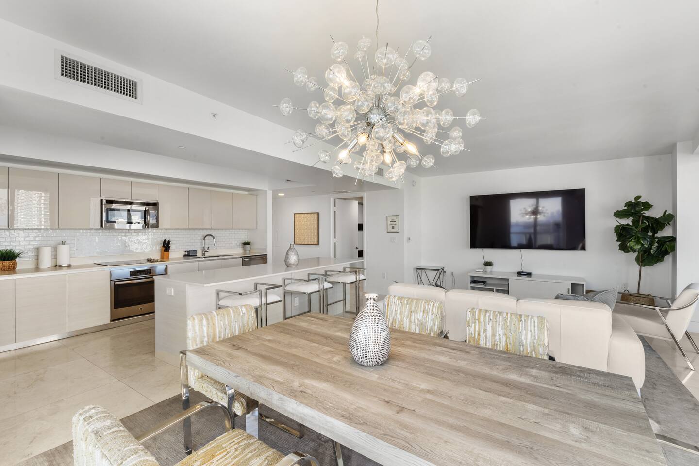 ⸻ 🍳 Kitchen The kitchen boasts a sleek, modern design with high-end stainless steel appliances, ample counter space, and a large island perfect for meal prep or casual dining. Fully equipped for all your cooking needs, it’s ideal for everything from quick snacks to full dinners. ⸻ 🥂Dining Area The dining area offers a stylish setting with a modern chandelier and seating for six, surrounded by floor-to-ceiling windows. It also includes bar seating for three, allowing you to enjoy meals with breathtaking views of the ocean, Intracoastal, and city skyline for a memorable dining experience any time of day. ⸻ 🛋️ Living Room Stylish open-concept living area with modern furnishings, plush seating, and floor-to-ceiling windows offering stunning water views. Flows into the dining area and a fully equipped kitchen with sleek, state-of-the-art appliances. ⸻ 🛏️Master Bedroom Unwind in the master suite, a spacious and tranquil haven featuring a luxurious king-sized bed with premium linens and direct access to the balcony. Floor-to-ceiling windows fill the room with natural light and offer stunning views, while the in-room master bathroom adds privacy and convenience, making this the perfect retreat after a day of adventure. ⸻ 🛏️ Second Bedroom The second bedroom offers a cozy and stylish escape with a comfortable queen-sized bed, ample storage, and a large window that invites in natural light. It features an in-room bathroom for added privacy and convenience, making it perfect for guests or family members seeking a restful night’s sleep. ⸻ 🛏️Third Bedroom Designed for flexibility and comfort, the third bedroom features two single beds, making it perfect for children, extra guests, or group travelers. Bright and inviting, it offers large windows with scenic views and a refreshing atmosphere, along with a dedicated bathroom that can be easily accessed from the living room. ⸻ 🛁Master Bathroom The master bathroom is a private en-suite retreat featuring a walk-in shower, relaxing bathtub, and dual sinks for added convenience. Bright lighting, a large mirror, and fresh towels complete this modern, elegant space designed for ultimate comfort. ⸻ 🛁Second Bathroom The second bathroom, located within the second bedroom, blends comfort and convenience with its clean, modern design. It offers a walk-in shower, fresh towels, and essential toiletries, creating a private space for guests to refresh and unwind during their stay. ⸻ 🛁Third Bathroom The third bathroom, accessible from the living room, offers convenience with its modern design. It features a shower-tub combo, fresh towels, and essential toiletries, creating a comfortable space for guests to refresh and unwind. ⸻ 🌅 Balcony Step onto your private balcony and take in panoramic ocean and city views. Whether sipping morning coffee or unwinding in the evening, this outdoor retreat offers a serene setting to enjoy the beauty of your surroundings. ⸻ 🧺 Washer/Dryer In-unit washer and dryer available for your convenience.