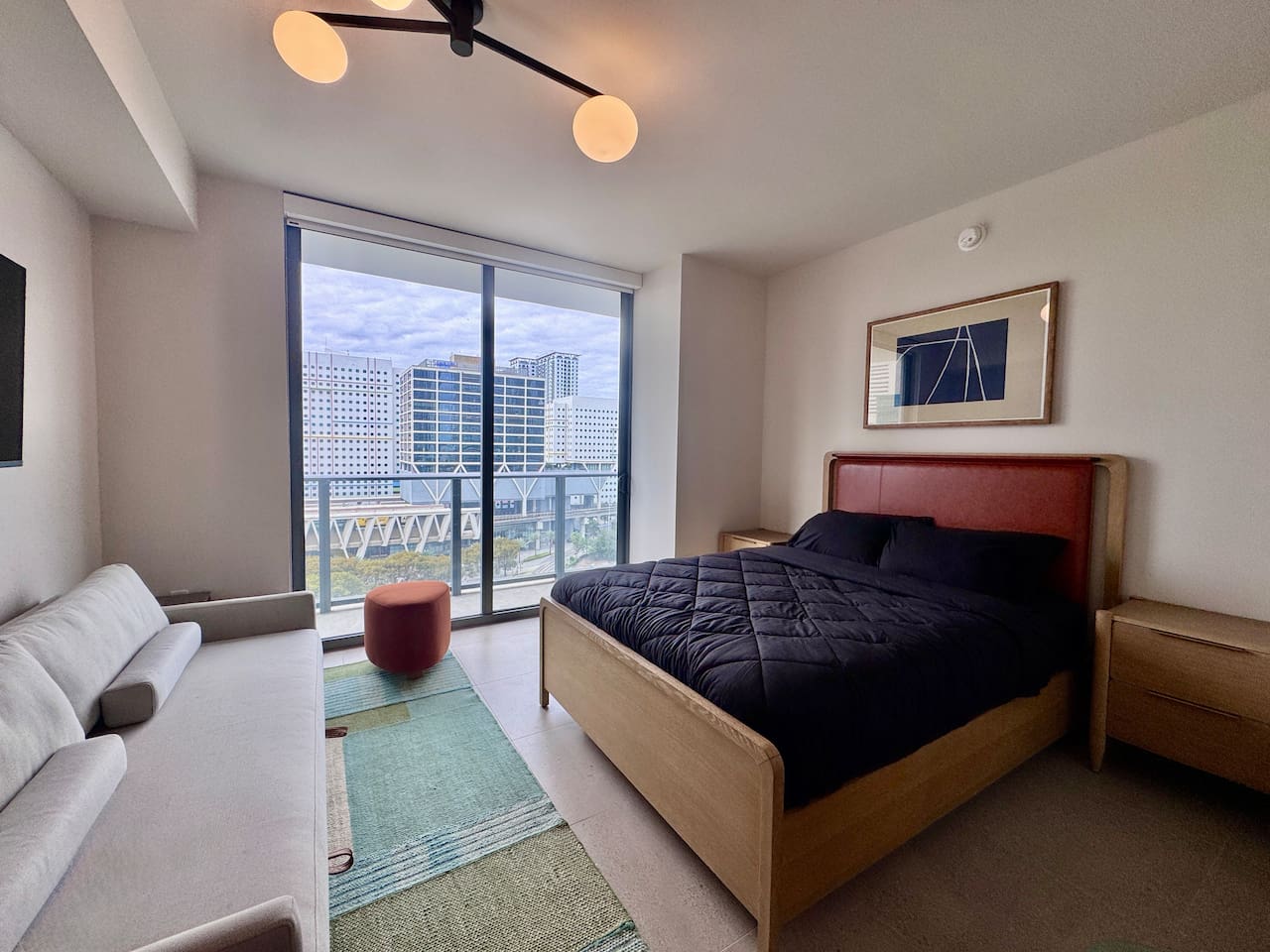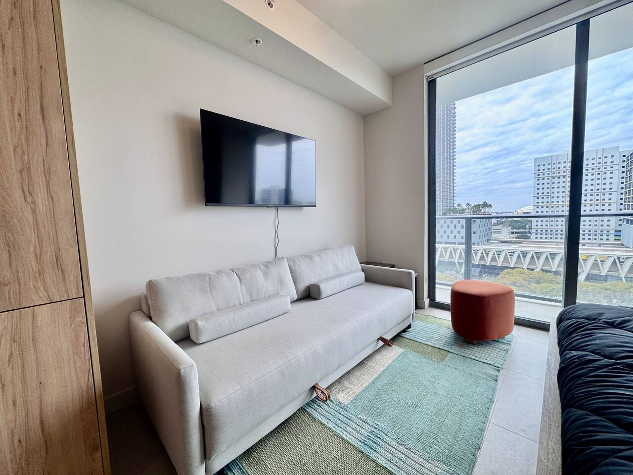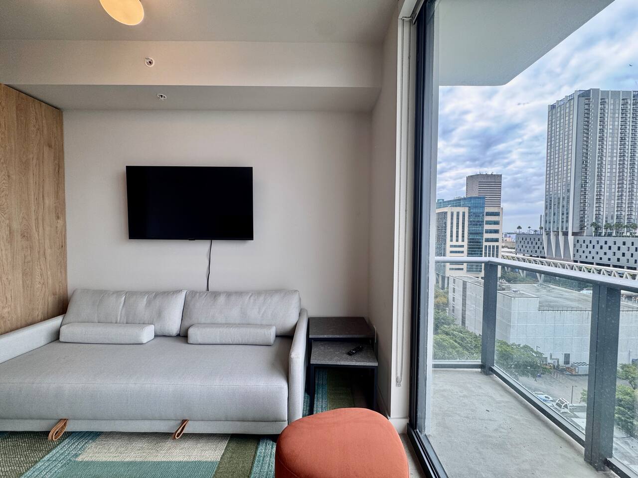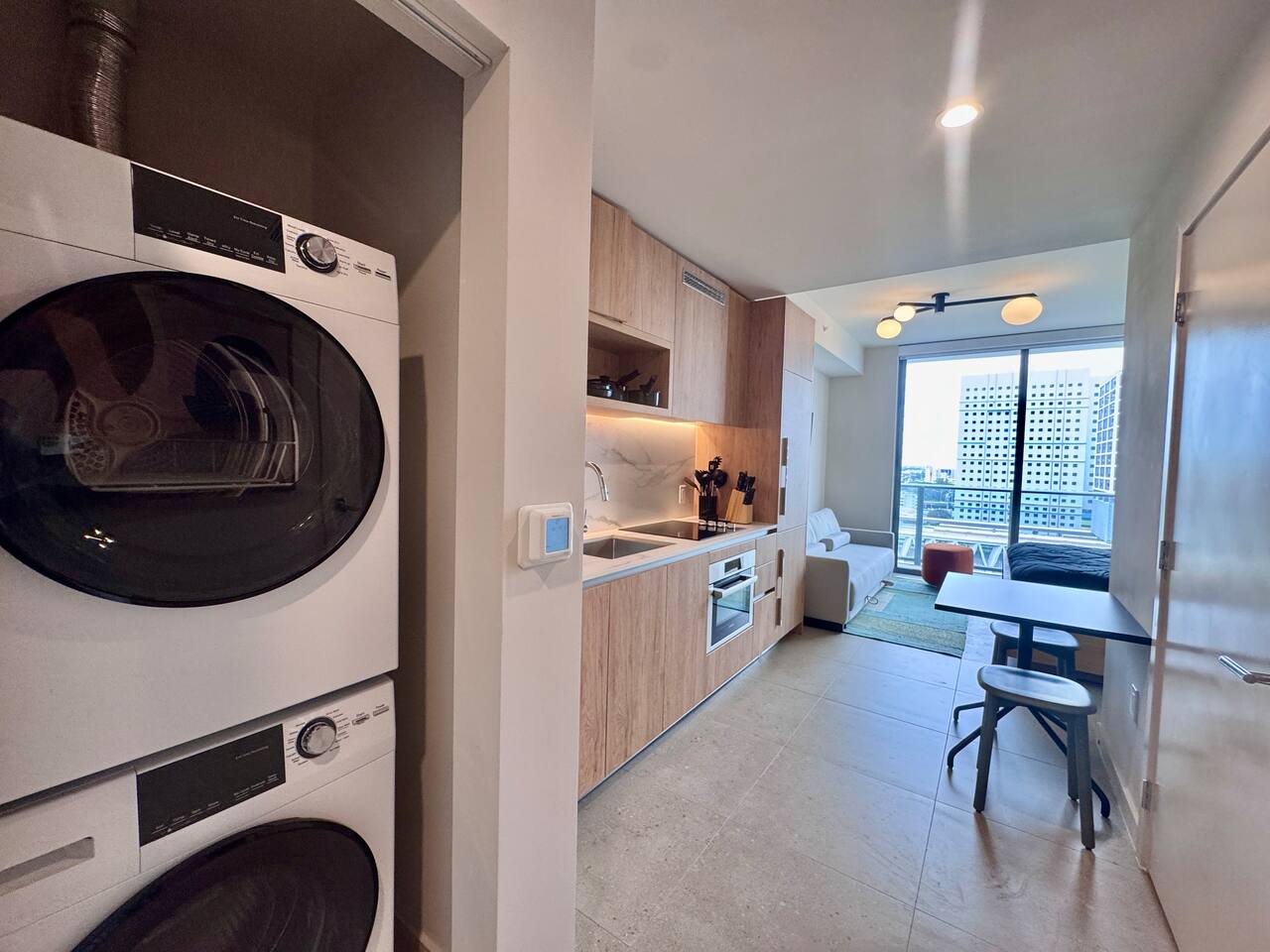 🛏️ Living & Sleeping Area: Welcome to a bright and thoughtfully designed studio where modern style meets comfort. The open-concept layout seamlessly combines the living and sleeping space, featuring a plush bed and inviting seating area perfect for relaxing after a day in Downtown Miami. Enjoy your favorite shows on the Smart TV while large windows fill the space with natural light, creating a sleek and airy atmosphere. ⸻ 🍳 Kitchen: The fully equipped kitchen has modern appliances, cookware, and all the essentials you’ll need for breakfast, lunch, or dinner. Everything is within easy reach, making meal prep simple and convenient. ⸻ 🧺 Washer & Dryer: An in-unit washer and dryer are included for your convenience, making longer stays stress-free and comfortable. ⸻ 🛁 Bathroom: Enjoy the beautifully appointed bathroom, complete with a spacious shower, sleek vanity, fresh towels, and elegant lighting designed to refresh and recharge you. ⸻ 🌇 Private Balcony: Step onto the private balcony and take in stunning city views. It’s the perfect place to enjoy your morning coffee or unwind in the evening as the Miami skyline lights up. ⸻ The studio includes air conditioning and high-speed WiFi throughout, ensuring a comfortable stay year-round. Book your stay today and experience modern comfort in the heart of Downtown Miami!