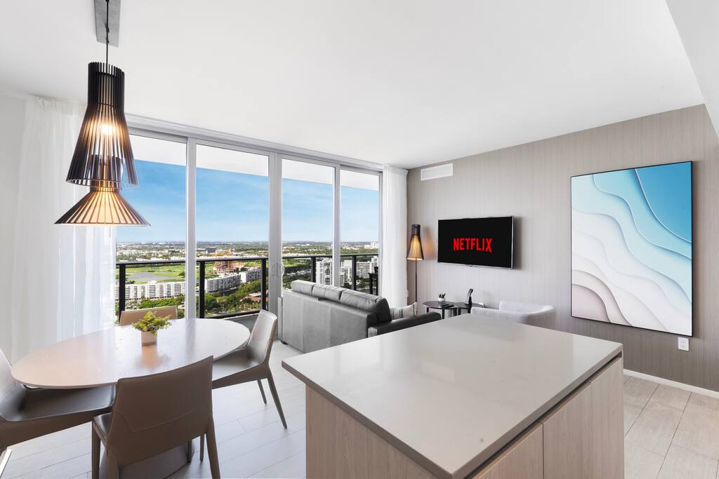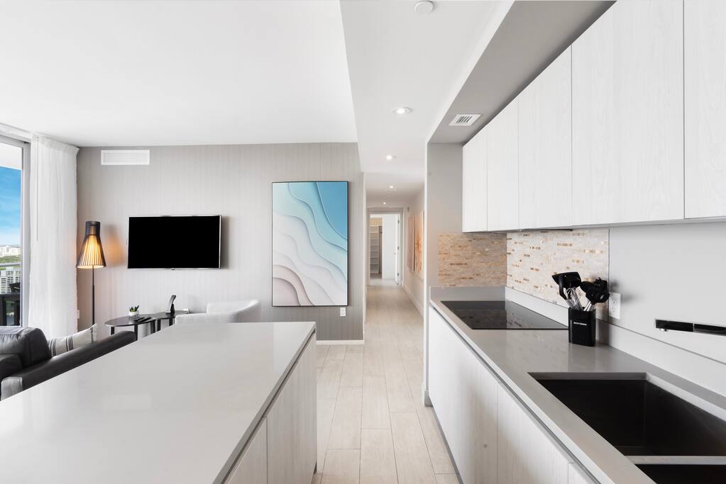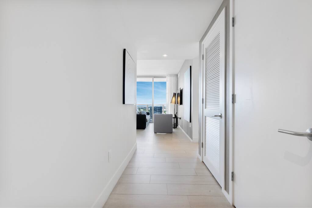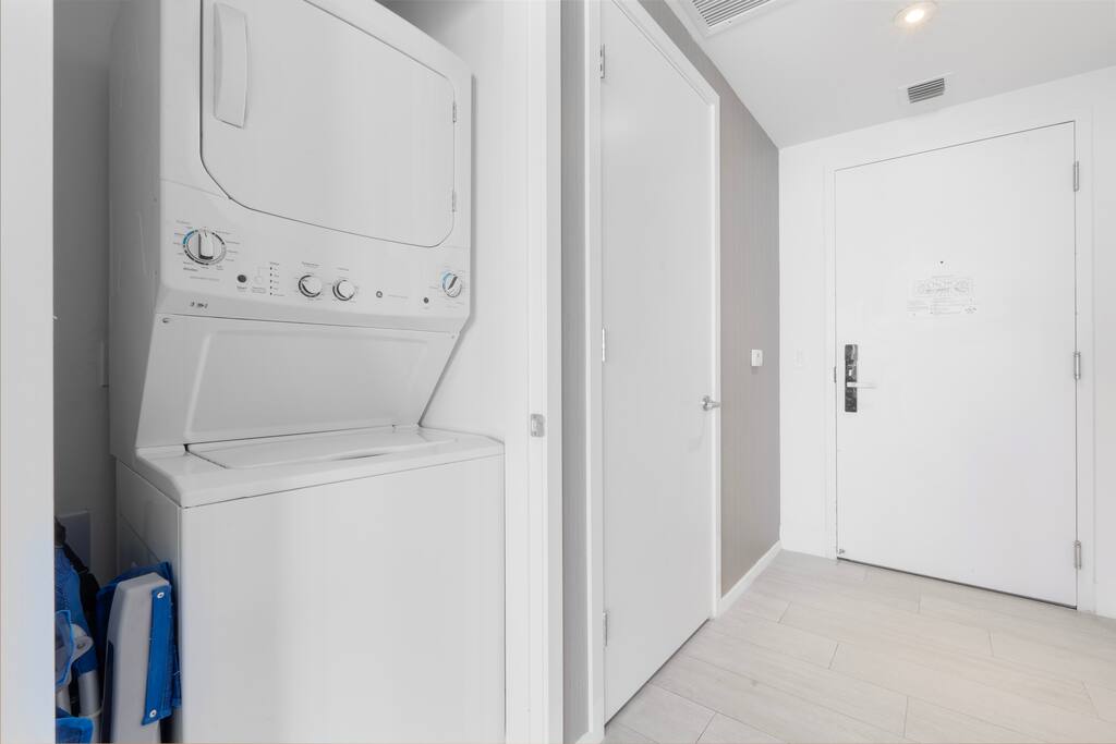 ⸻ 🛋️ Living Room: The living area is bright and inviting, featuring floor-to-ceiling windows that fill the space with natural light and open to a private balcony. A comfortable couch and armchair provide the perfect spot to unwind, while modern décor and a flat-screen TV complete this elegant and relaxing setting. ⸻ 🥂Dining Area: The dining area offers a relaxed, contemporary setting with a round table for four and stylish pendant lighting. It’s perfect for casual meals or remote work, seamlessly connected to the kitchen and living space for easy flow and comfort. ⸻ 🍳 Kitchen: The full kitchen is sleek and fully equipped with modern appliances, including an oven, stovetop, microwave, dishwasher, and coffee maker. Ample counter space and bar seating make it ideal for preparing meals or morning coffee. The adjacent dining area features a round table for four, framed by elegant pendant lighting for a warm and stylish touch. ⸻ 🛏️ Master Bedroom The master suite offers a peaceful retreat with a king bed, private bathroom, and direct access to the balcony. Enjoy a spacious walk-in closet, in-room safe, and a dedicated workspace ideal for remote work. Thoughtfully designed with soft lighting and modern décor, this room combines comfort, privacy, and style. ⸻ 🛏️ Second Bedroom This bright bedroom features two comfortable double beds and direct access to the balcony. A designated bathroom is conveniently located right next to the room, accessible from the living area. Thoughtful décor and natural light create a relaxing atmosphere perfect for families or friends. ⸻ 🛏️ Third Bedroom This cozy bedroom features a comfortable queen bed and direct access to the balcony. Natural light fills the space, creating a calm and restful setting. Soft tones, modern artwork, and convenient layout make it an inviting spot for relaxation after a day at the resort or beach. ⸻ 🛁Master Bathroom: This elegant bathroom features a spacious glass-enclosed shower, dual sinks, and a large mirror. Soft lighting, sleek finishes, and ample counter space create a clean, modern atmosphere perfect for relaxation. Conveniently located within the master bedroom, it ensures comfort and privacy. ⸻ 🛁Second Bathroom: This modern bathroom features a glass-enclosed shower, large mirror, and sleek vanity with ample counter space. Bright lighting and clean finishes create a refreshing space for daily routines or a quick post-beach refresh. ⸻ 🌅Private Balcony: The expansive balcony belongs exclusively to the unit, accessible from several rooms for a seamless indoor-outdoor experience. Guests can enjoy open views of the city and Intracoastal Waterway, with seating areas perfect for morning coffee or evening relaxation in complete privacy. ⸻ 🧺 Washer/Dryer: For added convenience, the unit includes an in-suite washer and dryer discreetly tucked behind closet doors. Guests can easily refresh clothes during longer stays, making the space as practical as it is comfortable.