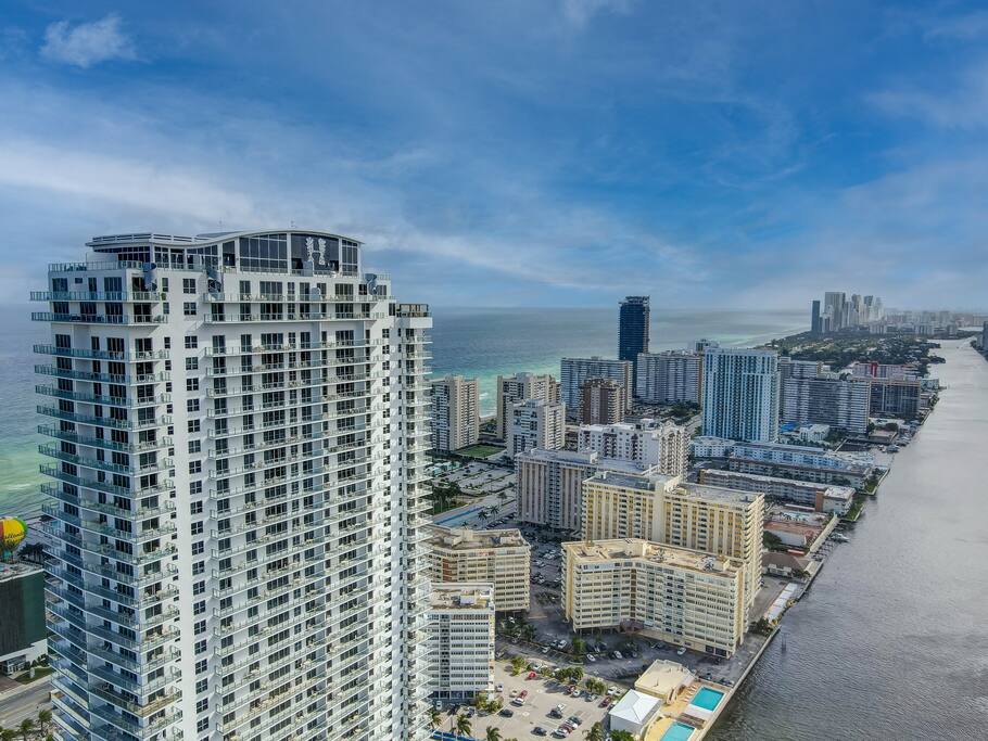 Hallandale Beach is a great town that sits squarely between Miami and Fort Lauderdale offering the best of each city only minutes away in a car. The neighborhood has plenty of shopping available with a Walmart right across the street for food shopping during extended stays, there are several restaurants available including Etaru which sits right on the Beach next to the building beach service area.