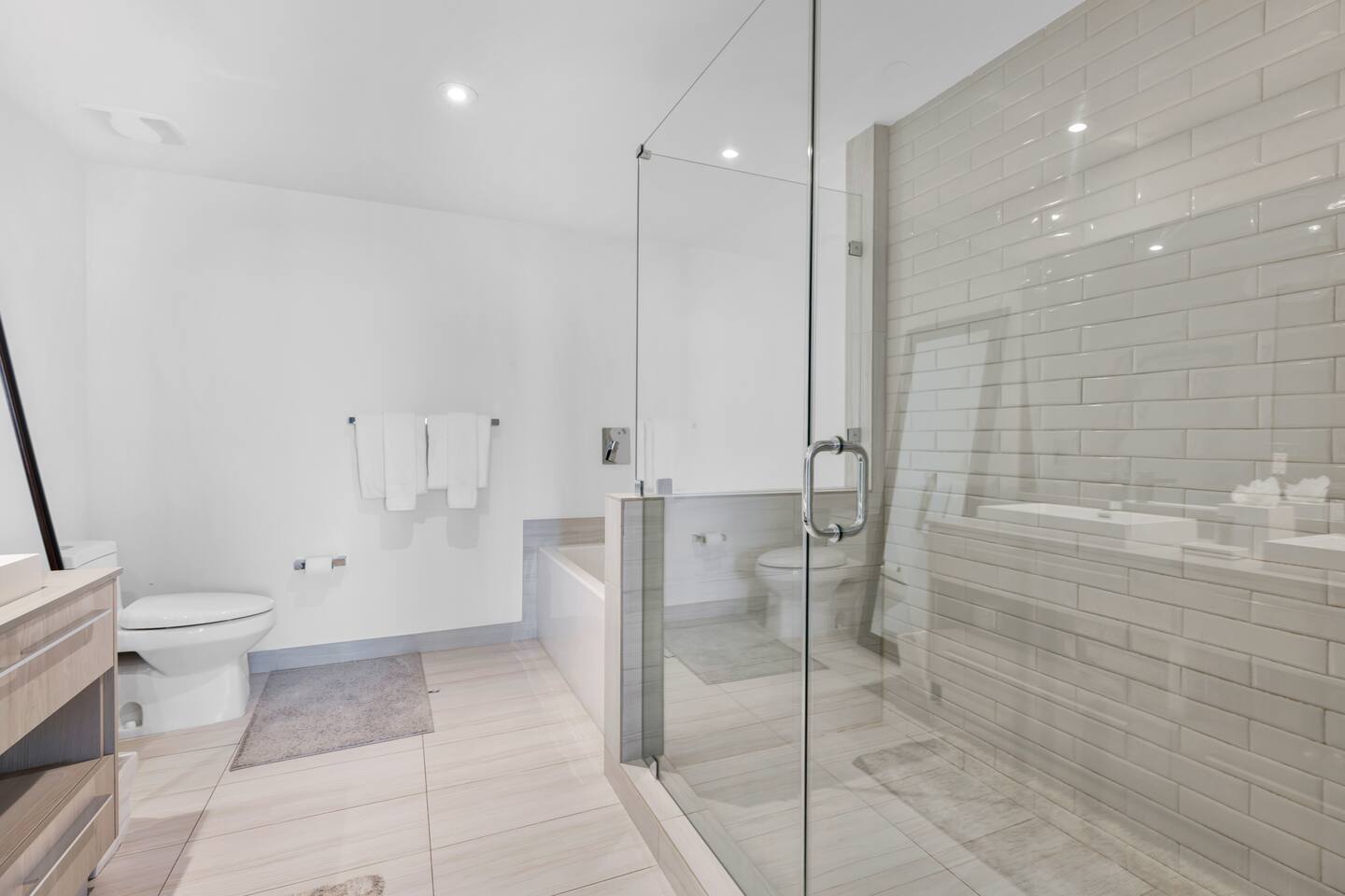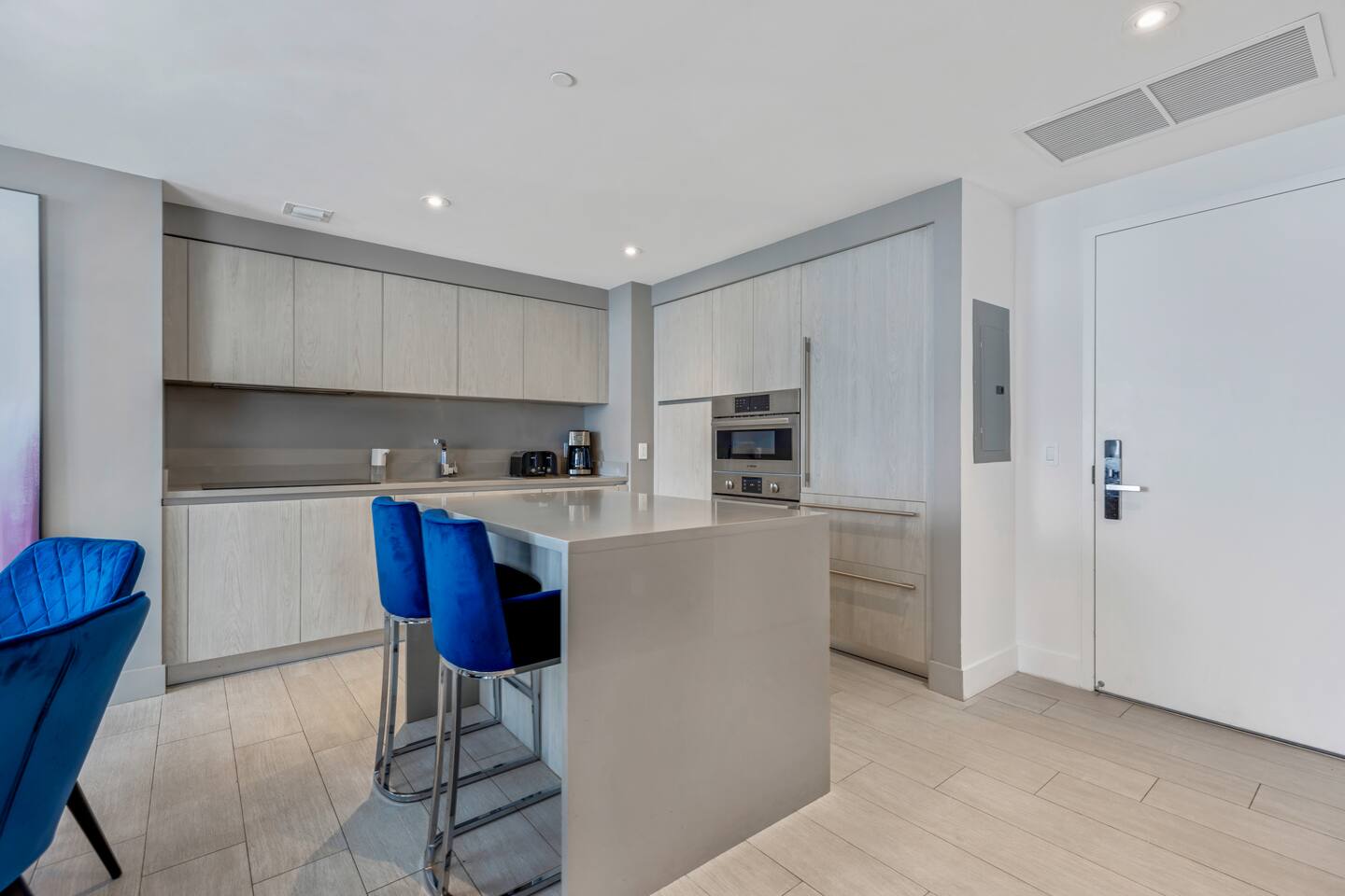 🛋️ Living Room: The living room features a bright, open layout with floor-to-ceiling windows showcasing direct ocean, city, and Intracoastal views. A stylish sofa bed folds out into a comfortable queen-size bed, and a TV provides the perfect setup for relaxing or watching your favorite shows. With direct access to the balcony, it’s an inviting space to unwind and enjoy the beautiful coastal scenery. ⸻ 🥂Dining Area: The dining area offers a modern and inviting space with a round table and plush seating for six. Elegant lighting and tasteful décor create a warm ambiance, perfect for shared meals or morning coffee before heading to the beach. Conveniently located next to the kitchen, it’s ideal for both casual and formal dining experiences. ⸻ 🍳 Kitchen: The kitchen features a sleek, contemporary design with premium appliances, ample counter space, and a convenient breakfast island with seating. Fully equipped with cookware, utensils, and essentials like a coffee maker and toaster, it’s ideal for preparing anything from a quick snack to a full meal. Perfectly positioned next to the dining area for easy entertaining. ⸻ 🛏️ Master Bedroom (Direct ocean view) The master bedroom offers a serene retreat with a luxurious king bed, elegant furnishings, and a private en suite bathroom. It includes a flat-screen TV, a spacious walk-in closet, a secure safe, and a convenient working space. Step directly onto the balcony to take in the stunning direct ocean views, making this room the perfect blend of comfort, style, and relaxation. ⸻ 🛌 Second Bedroom (Direct Ocean View): The second bedroom offers a bright and relaxing space with two double beds, a flat-screen TV, a private en suite bathroom, and a convenient working area. Floor-to-ceiling windows open onto the balcony, providing seamless access and stunning direct ocean views. It’s the perfect combination of comfort, functionality, and coastal elegance. ⸻ 🛁Master Bathroom: The master bathroom features a modern design with dual sinks, a spacious glass-enclosed shower, and a separate soaking tub for ultimate relaxation. Elegant finishes and ample counter space add a touch of luxury, creating a private spa-like retreat conveniently located within the master bedroom. ⸻ 🛁Second Bathroom: The second bathroom features a sleek modern design with a spacious walk-in shower, contemporary fixtures, and elegant tile finishes. Conveniently located within the second bedroom, it provides both comfort and privacy for guests. ⸻ 🌅 Private Balcony: Private balcony with comfortable seating and breathtaking views of the ocean, Intracoastal Waterway, and city skyline. It’s the perfect spot to enjoy morning coffee, read a book, or unwind in the evening while taking in the relaxing coastal atmosphere. ⸻ 🧺 Washer/Dryer: A convenient in-unit washer and dryer are tucked neatly behind closet doors, allowing you to refresh your wardrobe throughout your stay. Whether you’re here for a weekend or an extended visit, this practical feature ensures comfort and ease during your time at the resort.