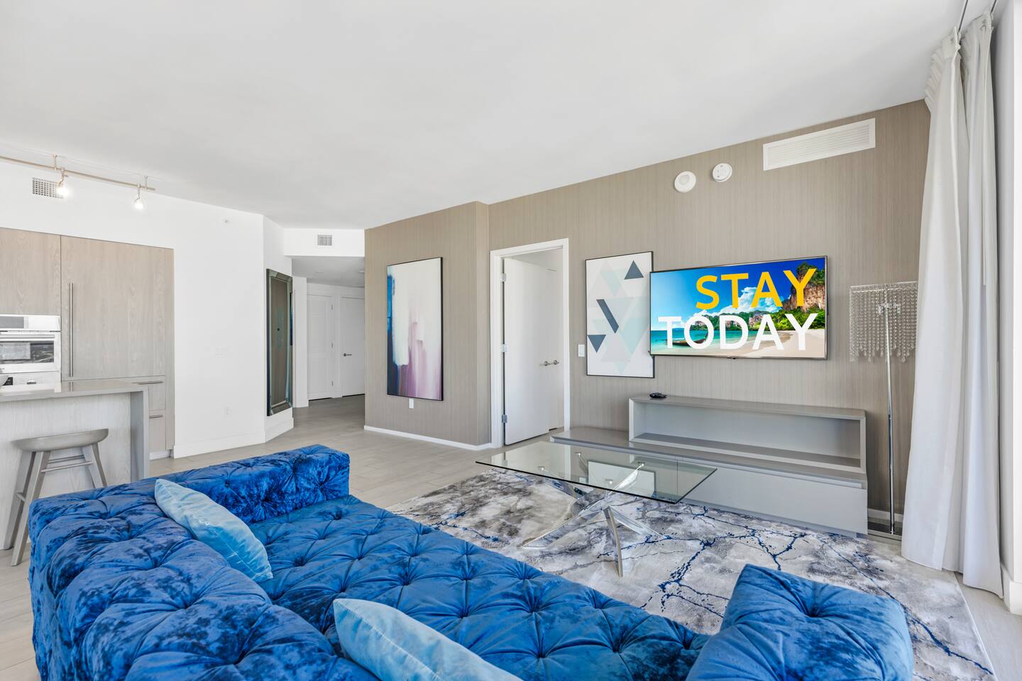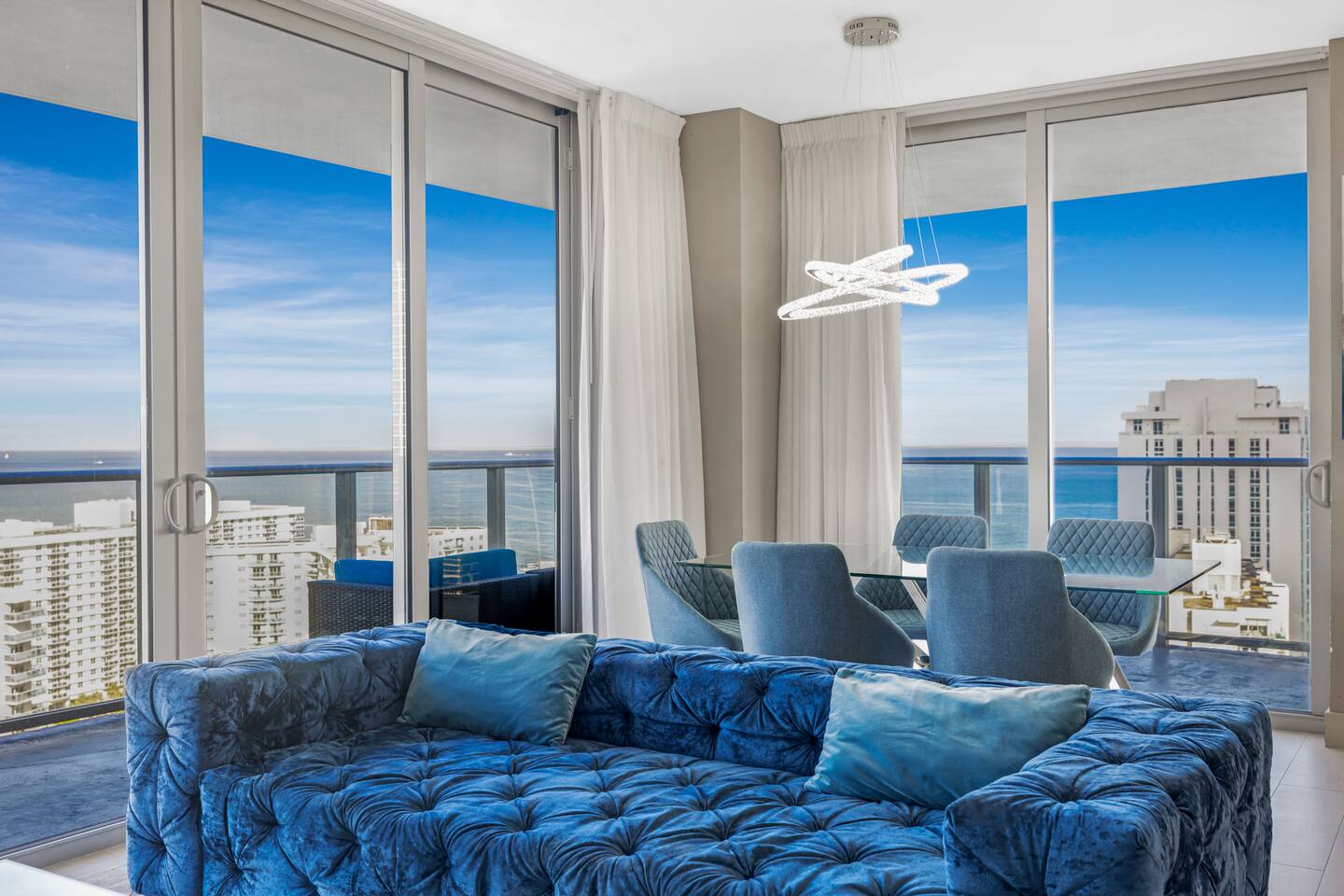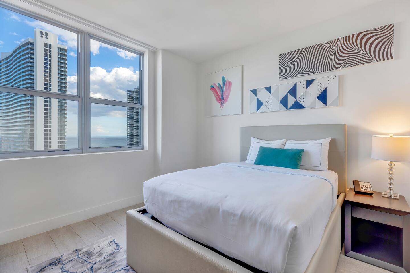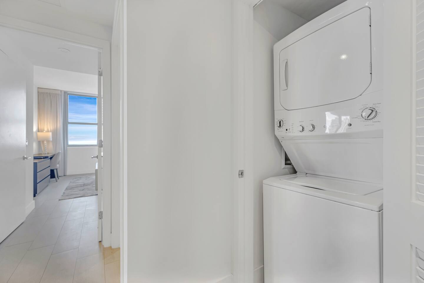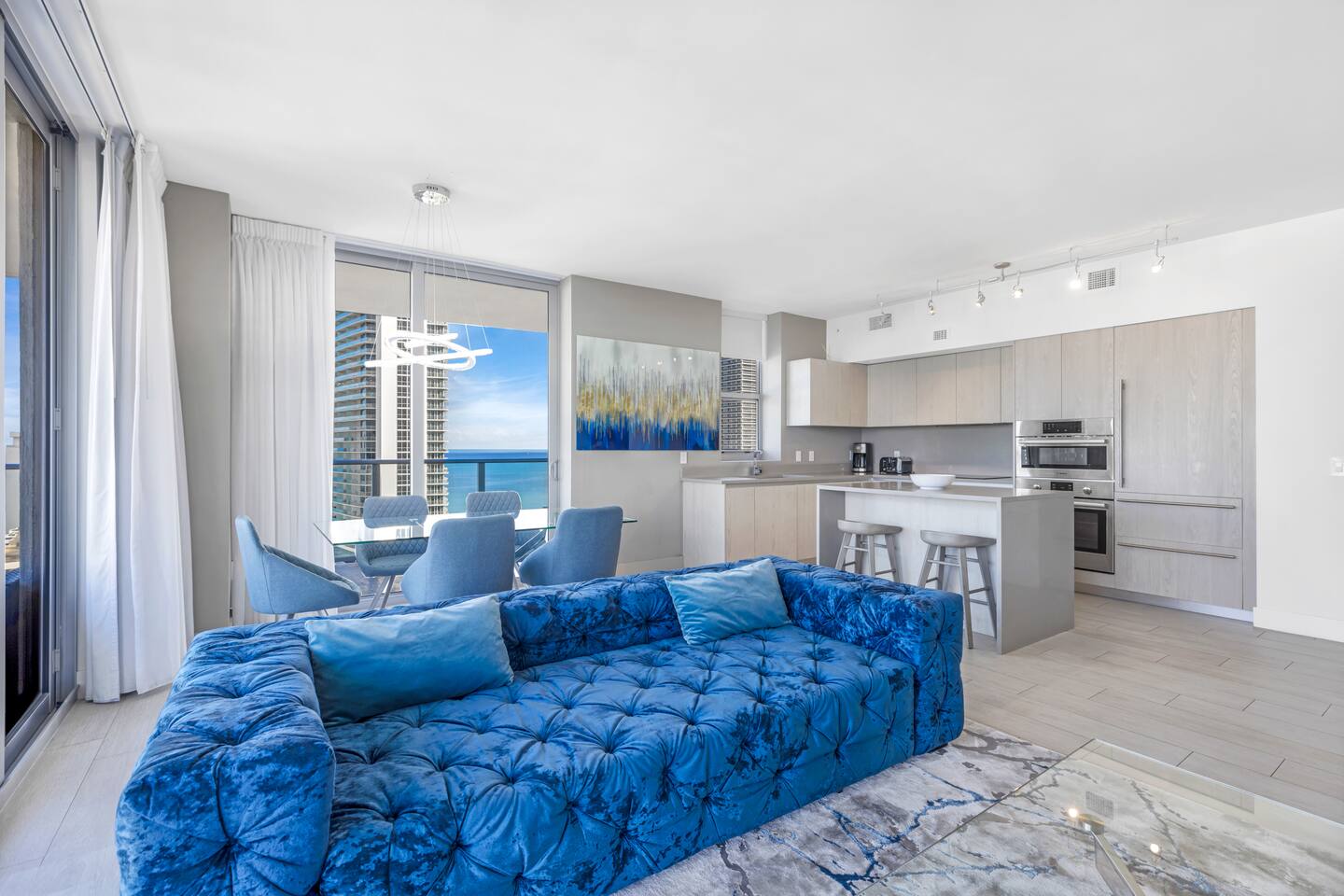 ✨ Welcome to your coastal escape where modern style meets effortless comfort. Wake up to sunlit ocean views, unwind in elegant interiors, and enjoy tranquil moments between the ocean and the bay. Whether you’re sharing time with loved ones or simply recharging, this serene retreat offers the perfect blend of relaxation and sophistication, with every detail designed for your comfort and peace of mind. ⚠️Kindly review and agree to everything described in "Other things to note"⚠️ ⸻ 🛋️ Living Room: Bright and inviting, the living room features floor-to-ceiling windows framing stunning ocean, city, and Intracoastal views. A plush blue sofa unfolds into a comfortable queen-size bed, offering both style and functionality. A flat-screen TV provides entertainment for relaxing nights in. Step out onto the private balcony to enjoy the breeze, or unwind inside surrounded by modern décor and soft natural light. ⸻ 🥂Dining Area: Set beside floor-to-ceiling windows, the dining area offers a bright, airy space with sweeping ocean and city views. A sleek glass table with seating for six creates the perfect setting for shared meals or morning coffee. Whether it’s a relaxed breakfast or a candlelit dinner, every moment here comes with a stunning backdrop. ⸻ 🍳 Kitchen: The full kitchen combines modern design with everyday convenience. Featuring sleek cabinetry, high-end appliances, and a spacious island with bar seating for two, it’s fully equipped with cookware, utensils, and essentials for home-style meals. Whether you’re preparing breakfast or hosting dinner, this elegant space makes cooking effortless and enjoyable. ⸻ 🛏️ Master Bedroom(Intercostal/Side ocean view): Elegant and serene, the master bedroom features a plush king-size bed, walk-in closet, private bathroom, and a TV for relaxation. Floor-to-ceiling windows open to the balcony, revealing city, Intracoastal, and side ocean views. A dedicated workspace and in-room safe add convenience, making this peaceful retreat perfect for both rest and productivity. ⸻ 🛏️ Second Bedroom (Intracoastal/Direct ocean view): Bright and cozy, the second bedroom features a comfortable double bed with an additional trundle bed for extra guests. A TV and workspace provide comfort and convenience, while large windows frame stunning city, Intracoastal, and direct ocean views. The designated bathroom is located just next to the room with easy access from the living area. ⸻ 🛁Master Bathroom: Spacious and elegant, the master bathroom features a glass-enclosed shower, a relaxing bathtub, and dual vanities for extra convenience. With sleek finishes and soft lighting, it offers a serene retreat to unwind and refresh. Located directly within the master bedroom, it provides both privacy and comfort. ⸻ 🛁Second Bathroom: Modern and bright, the second bathroom features a sleek glass-enclosed shower, elegant vanity, and soft neutral tones that create a clean, refreshing atmosphere. Conveniently located next to the second bedroom with access from the living area, it offers both style and practicality for guests’ comfort. ⸻ 🌅Private Balcony: The private balcony offers a peaceful outdoor retreat with sweeping views of the ocean, city skyline, and Intracoastal Waterway. Furnished with comfortable seating, it’s an inviting space to enjoy your morning coffee, unwind after a day at the beach, or simply take in the fresh coastal breeze and breathtaking scenery. ⸻ 🧺 Washer/Dryer: In-unit washer and dryer available for your convenience.