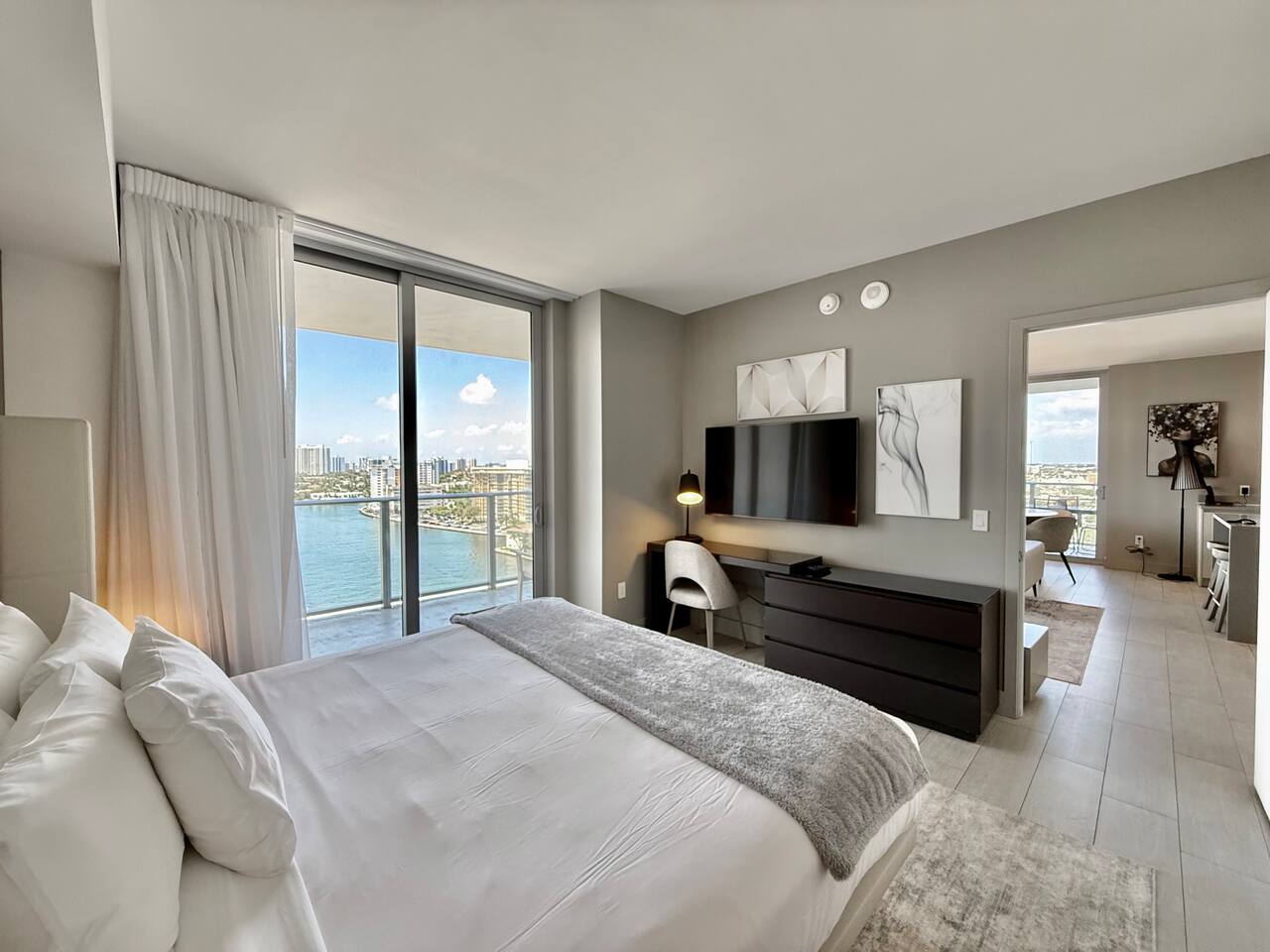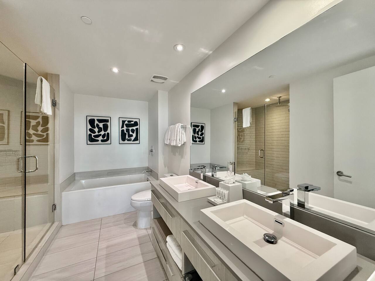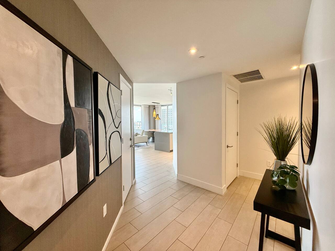 🛋️ Living Room: The living room features an open, modern layout filled with natural light and framed by floor-to-ceiling windows showcasing direct city and Intracoastal views. A comfortable couch, stylish décor, and a flat-screen TV create an inviting space for relaxation and entertainment, while the seamless access to the private balcony lets you enjoy the refreshing breeze and stunning scenery day or night. ⸻ 🥂Dining Area: The dining area offers a stylish and comfortable setting for shared meals and gatherings. A modern table with seating for six sits beside large windows, allowing natural light to fill the space and reveal beautiful city views. Two additional bar seats at the kitchen island provide a casual spot for coffee, breakfast, or evening drinks while enjoying the open, airy ambiance. ⸻ 🍳 Kitchen: The kitchen features a sleek, contemporary design with high-end finishes and modern appliances. It includes an oven, stove, microwave, refrigerator, coffee machine, and toaster, making it easy to prepare anything from a quick breakfast to a full dinner. A spacious island with two bar seats adds convenience and serves as a casual dining space, all within a bright and open layout connected to the living and dining areas. ⸻ 🛏️ Master Bedroom: The master bedroom offers a serene retreat with a luxurious king bed, elegant furnishings, and warm lighting that creates a calm and inviting atmosphere. It includes a flat-screen TV for entertainment and floor-to-ceiling windows that open directly onto the balcony, offering beautiful city views and plenty of natural light. The room also features a private in-suite bathroom for added comfort and convenience. ⸻ 🛏️ Second Bedroom: The second bedroom features two comfortable double beds, a spacious walk-in closet, and access to a private balcony with beautiful city views. It includes a flat-screen TV and a dedicated workspace with a desk and lamp, perfect for relaxation or remote work. The designated bathroom is located right next to the bedroom, accessible from the living room for added convenience. ⸻ 🛏️ Third Bedroom: The third bedroom offers two comfortable single beds, ideal for friends or family members sharing the space. A flat-screen TV provides entertainment, while a dedicated workspace with a desk and lamp makes it convenient for reading or remote work. The room’s large window allows natural light to brighten the space, creating a calm and pleasant atmosphere. ⸻ 🛁Master Bathroom: The master bathroom, located within the master bedroom, features a modern and elegant design with premium finishes. It includes a spacious walk-in shower with glass doors, a relaxing bathtub, and a sleek vanity with a large mirror and ample counter space. Soft lighting and high-quality amenities create a spa-like atmosphere perfect for unwinding after a long day. ⸻ 🛁Second Bathroom: The second bathroom is conveniently located next to the second bedroom, with easy access from the living room. It features a modern walk-in shower with glass doors, a wide vanity with a large mirror, and soft lighting that enhances its clean, contemporary design. Fresh towels and essential toiletries are provided for a comfortable and refreshing experience. ⸻ 🛁Third Bathroom: The third bathroom features a clean, minimalist design with modern fixtures and soft neutral tones. It includes a large mirror, a sleek pedestal sink, and fresh towels for guests' convenience. Bright lighting and tasteful décor add a touch of elegance, making it a comfortable and functional space for daily use. ⸻ 🌅Private Balcony: The private balcony extends along the entire length of the residence, offering panoramic views of the Intracoastal Waterway and city skyline. Furnished with multiple seating areas, including a dining table and lounge chairs, it’s perfect for enjoying morning coffee, outdoor meals, or simply relaxing while taking in the fresh breeze and scenic surroundings. ⸻ 🧺 Washer/Dryer: In-unit washer and dryer available for your convenience.