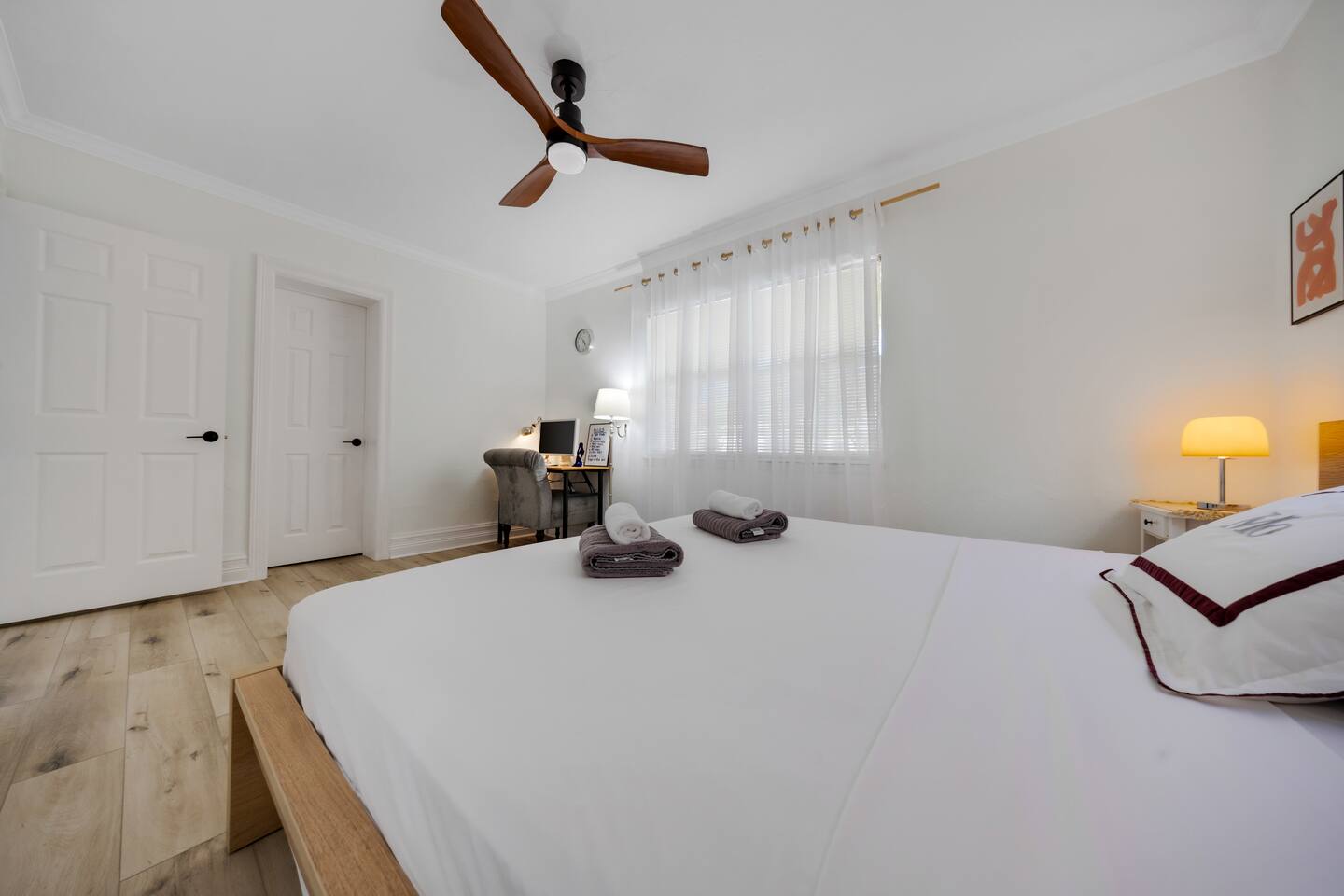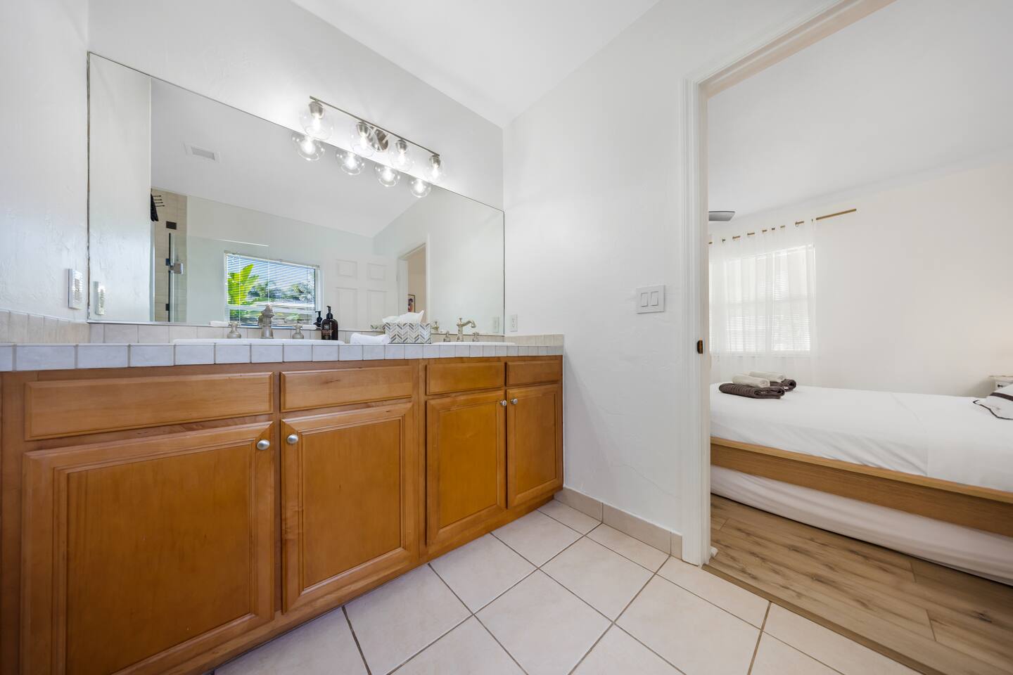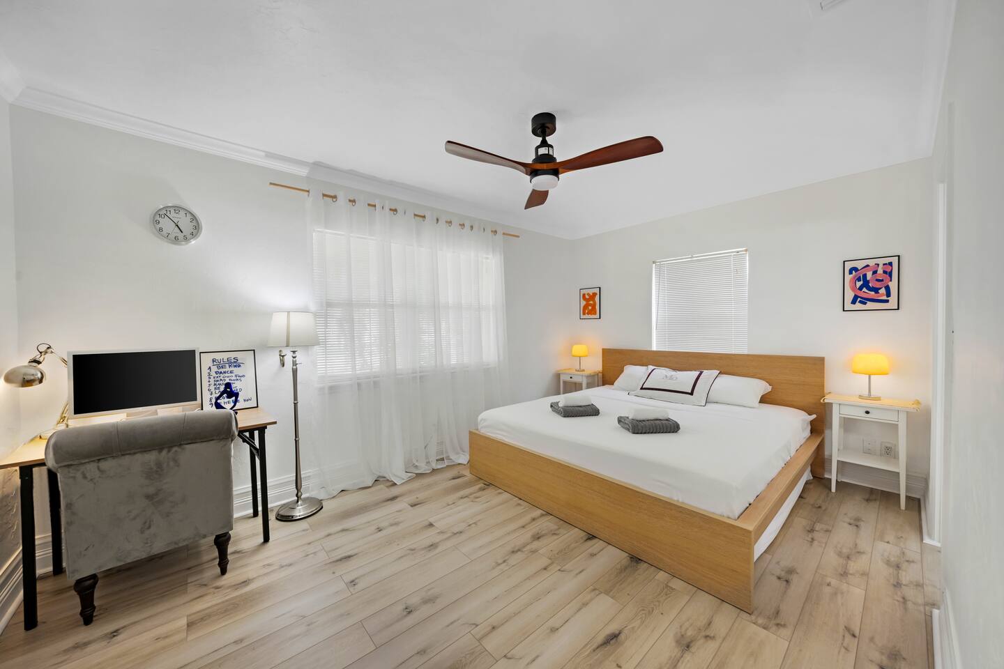 🛏️ BEDROOMS & 🚿 BATHROOMS: ✦ Bedroom 1: King-size bed, dedicated workspace, and large windows with soft natural light. A bright and spacious retreat designed for both relaxation and productivity. ✦ Bedroom 2: Queen-size bed, warm lighting, and modern décor. Peaceful and comfortable, ideal for couples or family members. ⸻ ✦ Bathroom 1: En-suite to Bedroom 1 with a walk-in shower, glass door, wide mirror, and long vanity counter providing extra space and convenience. ✦ Bathroom 2: Located near Bedroom 2, featuring a bathtub-shower combo, bright lighting, and fresh towels. ⍟ Each bedroom and bathroom combines comfort, privacy, and simplicity, ensuring a calm and refreshing stay. ⸻ 🛋️ LIVING AREA: ✦ Bright and spacious open-concept living room filled with natural light and warm tones. ✦ Modern gray sofa with blue accent pillows offering a cozy space to relax or watch the flat-screen TV. ✦ Two stylish velvet armchairs create a comfortable seating area for conversation or reading. ✦ Ceiling fan keeps the room cool and pleasant throughout the day. ✦ Seamless flow to the breakfast bar and kitchen, ideal for gathering with family or friends. ⍟ The inviting design and airy layout make this space perfect for relaxing after a day by the pool or exploring Fort Lauderdale. ⸻ 🍳KITCHEN & DINING: ✦ Fully equipped kitchen with stainless steel appliances including a refrigerator, stove, microwave, and dishwasher. ✦ Ample counter space, modern lighting, and white cabinetry creating a bright and practical cooking area. ✦ Essentials provided for your stay such as cookware, utensils, dishes, and glassware. ✦ Dining area with a sleek wooden table set for four, perfect for shared meals or casual mornings. ✦ Breakfast bar with two stools offers a relaxed spot for coffee or light snacks. ⍟ Whether preparing a full meal or enjoying takeout from nearby restaurants, this kitchen makes dining effortless and enjoyable. ⸻ 🌴 OUTDOOR SPACE: ✦ Private fenced backyard surrounded by lush greenery and palm trees, creating a relaxing tropical atmosphere. ✦ Sparkling swimming pool with comfortable lounge chairs for sunbathing and quiet afternoons. ✦ Outdoor dining area with a six-seat table, ideal for family meals or evening gatherings. ✦ BBQ grill available for casual cookouts under the Florida sun. ✦ Paved patio and well-kept lawn providing plenty of space to unwind or play. ⍟ Whether you’re enjoying a swim, grilling outdoors, or simply relaxing with a drink in hand, this backyard offers a peaceful retreat in the heart of Fort Lauderdale.