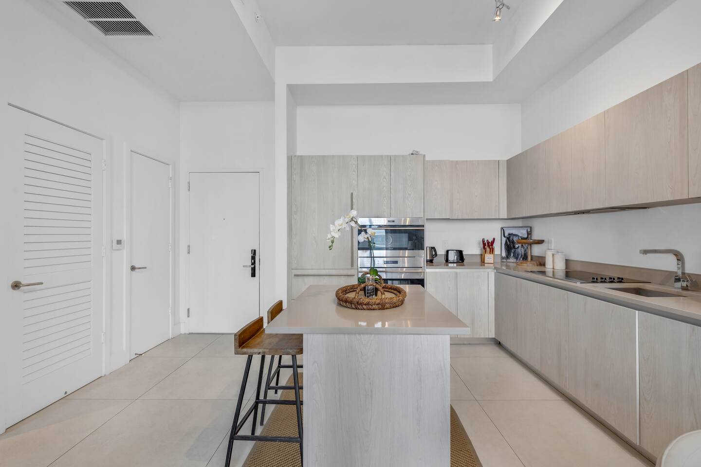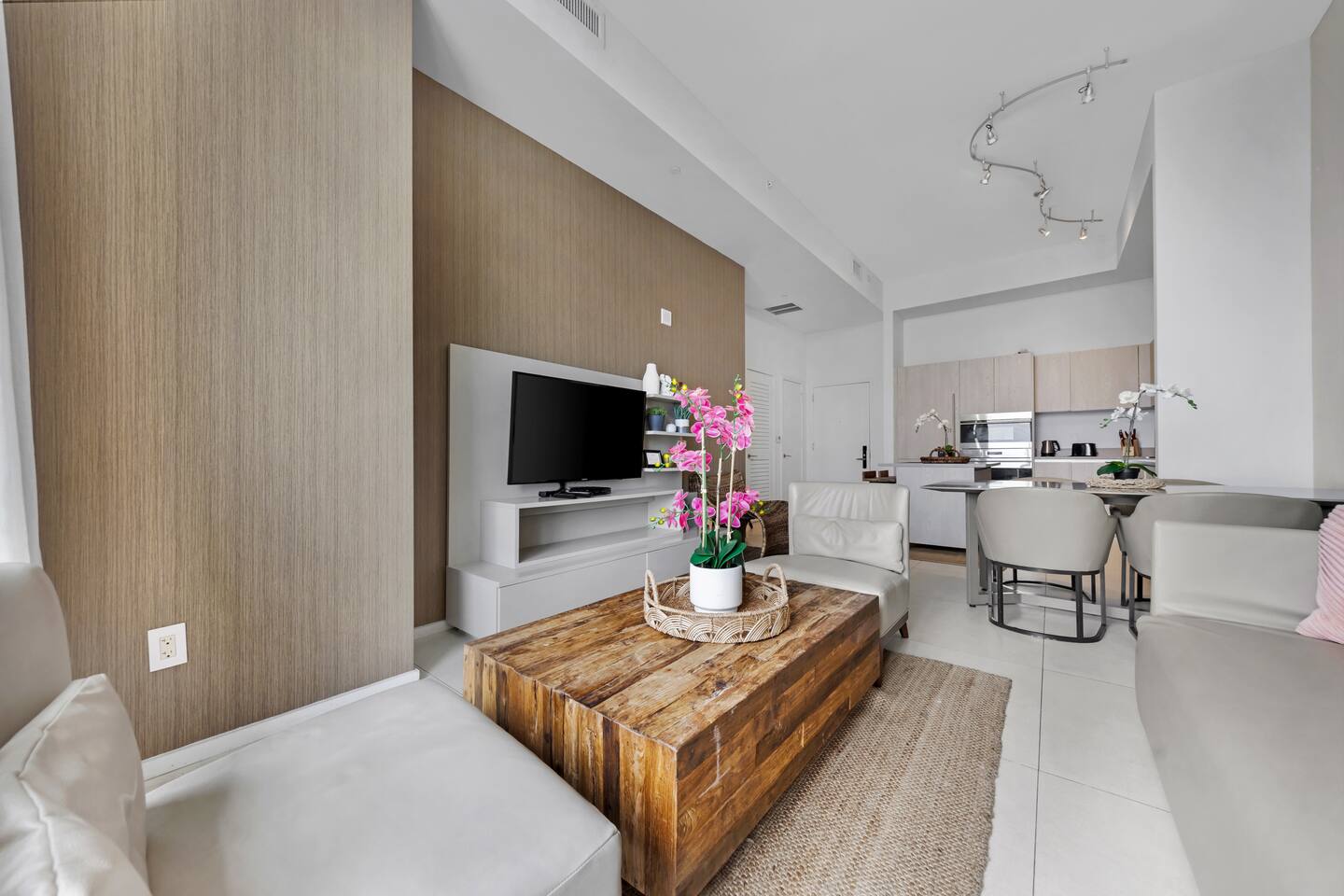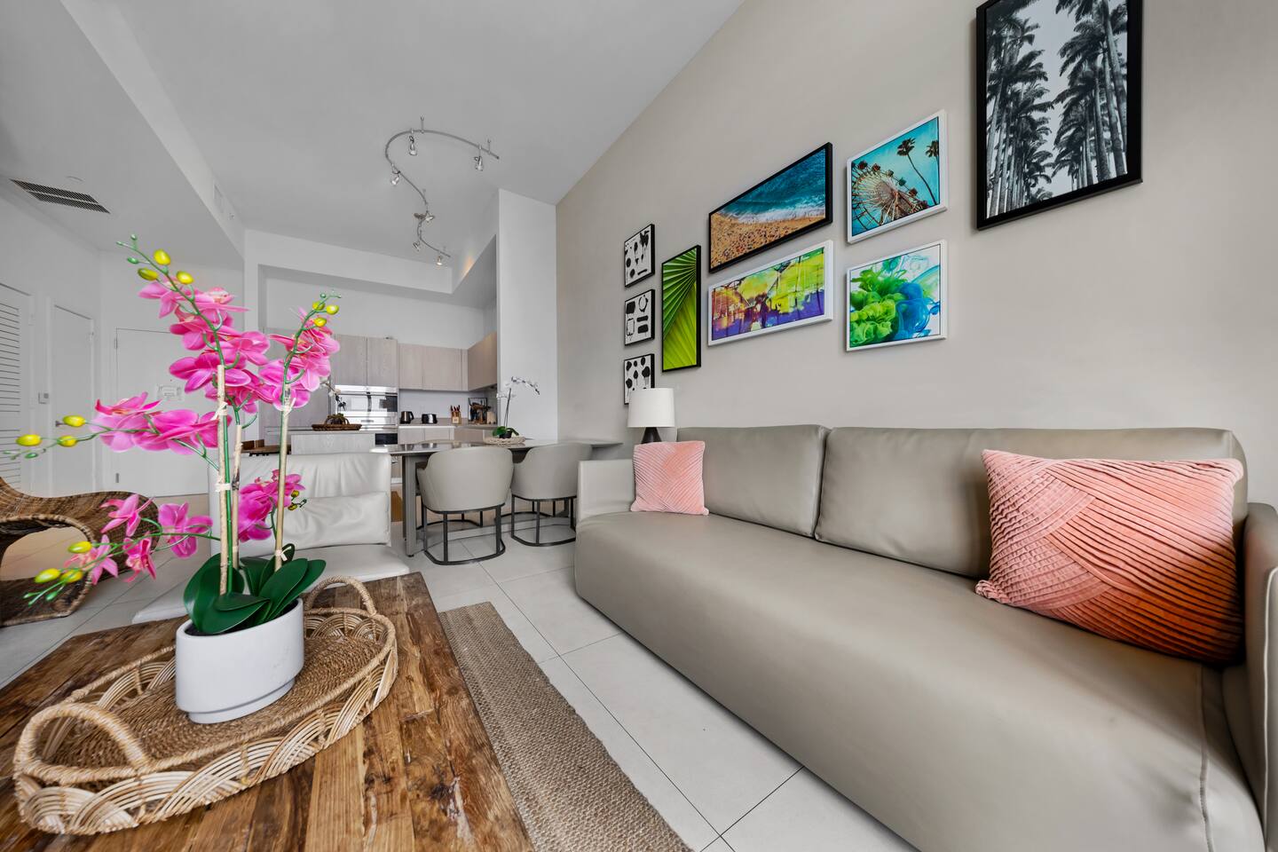 🏡Step inside to find a haven of sophistication, where every piece of top-notch furniture has been carefully selected to enhance your living experience. The spacious living areas with high ceilings are ideal for relaxing or entertaining, seamlessly blending style with functionality. ⸻ 🛋️ Living Room: The living room offers a welcoming space designed for relaxation and convenience. The sofa folds into a full-size double bed, providing extra sleeping arrangements, while the 50-inch TV ensures easy access to entertainment. Warm, modern décor and natural touches create a comfortable setting for unwinding after a day at the beach or exploring the city. ⸻ 🥂Dining Area: The dining area provides a cozy setting for shared meals and meaningful moments, with seating for four that makes every gathering feel special. Its warm and inviting atmosphere enhances your stay and creates the perfect place to connect. ⸻ 🍳 Kitchen: The kitchen is fully equipped with modern appliances, ample counter space, and premium cookware, offering everything you need to prepare meals with ease. A sleek island with two bar seats makes it just as perfect for a quick breakfast as for a gourmet dinner, blending style with functionality. ⸻ 🛏️ Bedroom (Ocean view): The bedroom features a comfortable king-size bed with soft linens and plush pillows, creating the perfect setting for restful sleep. A designated working space makes it easy to stay productive, while a walk-in closet provides ample storage. Step out to your private balcony to enjoy fresh air and natural light, or unwind with entertainment on the 43-inch TV. For added convenience, the bathroom is located right next to the bedroom. ⸻ 🛁 Bathroom: The bathroom offers a sleek, modern design with a spacious glass-enclosed shower. Fresh towels, shampoo, and conditioner are provided, ensuring a refreshing and comfortable experience throughout your stay. ⸻ 🌅Private Balcony: The balcony offers a refreshing escape with open views of the ocean and swaying palms below. A perfect spot to enjoy your morning coffee, breathe in the sea air, and take in the beauty of Hollywood Beach. ⸻ 🧺 Washer/Dryer: A washer and dryer are available in the unit, providing the convenience of doing laundry during your stay so you can always have fresh clothes on hand.