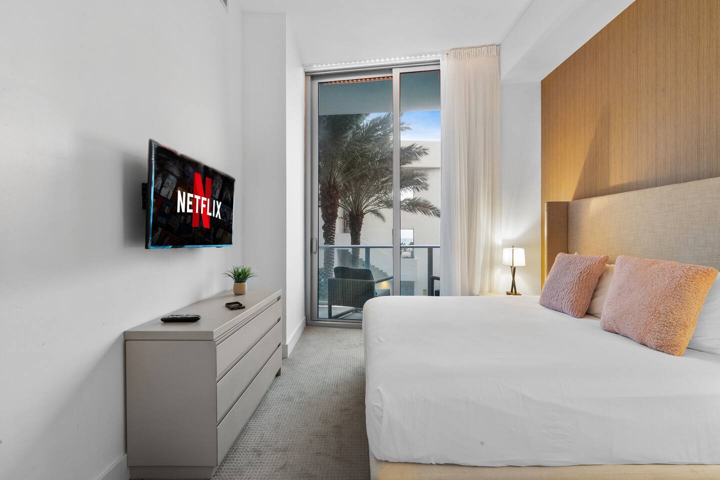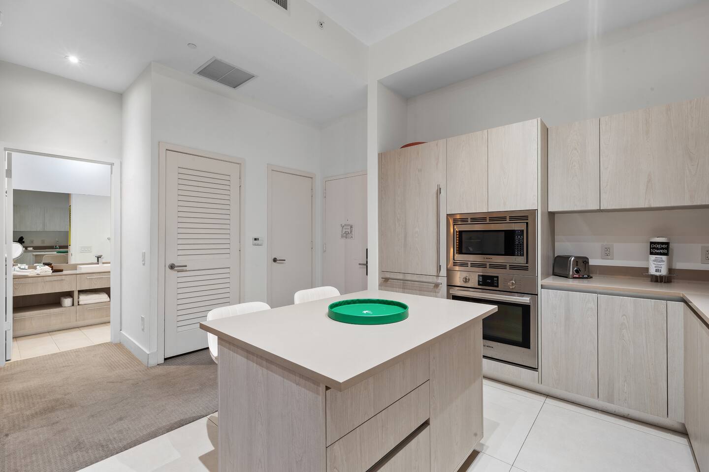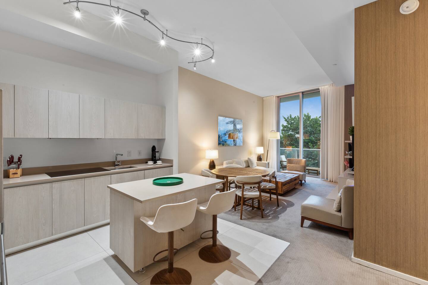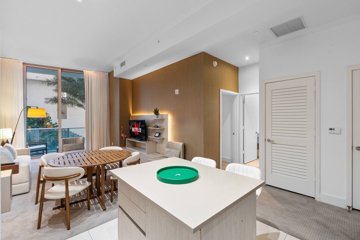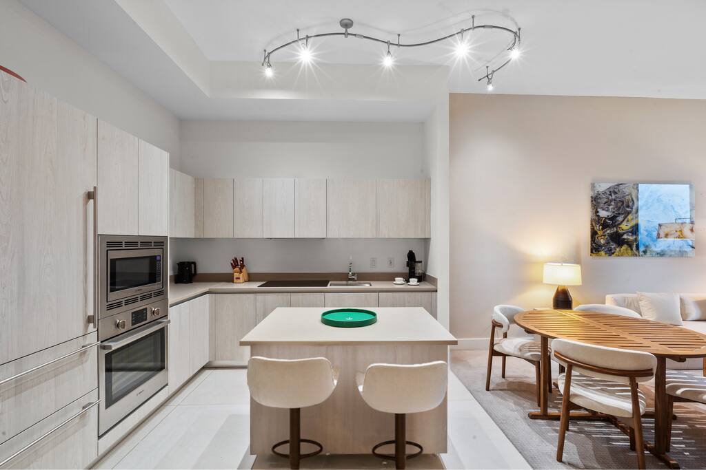 🏝️We welcome you to pamper yourself with an extraordinary vacation at one of the most lavish resorts, where we fulfill your cravings for opulence. This destination is ideal for groups of friends and families in search of an elegant Florida retreat. Additionally, the space caters to individuals yearning for a romantic escape with their beloved companions. ⸻ 🛋️ Living Room: Relax in the bright and modern living room, where a stylish sofa easily transforms into a full-size bed and two armchairs invite you to unwind. Watch your favorite shows on the flat-screen TV or gather at the dining table for four. Sliding glass doors lead to a private balcony, bringing in fresh light and outdoor views. ⸻ 🥂Dining Area: The dining area offers a modern round table with comfortable seating for four, creating the perfect spot for shared meals, conversations, or working while enjoying the natural light from the balcony. ⸻ 🍳 Kitchen: The kitchen is thoughtfully designed for both convenience and style, featuring sleek modern appliances, ample cabinetry, and all essential cookware to prepare meals with ease. A spacious island with seating for two creates the perfect spot to enjoy coffee, casual bites, or good conversation. With the added benefit of an in-unit washer and dryer, this space combines functionality and comfort to make your stay effortless. ⸻ 🛏️ Bedroom: The bedroom features a plush king-size bed dressed in high-quality linens, creating a restful retreat after a day of sun and exploration. Step onto your private balcony for fresh air and relaxation, or unwind indoors with the HD TV. A foldable single bed stored in the closet offers flexibility for extra guests. For added convenience, a designated bathroom is located right next to the bedroom. A perfect balance of comfort and elegance awaits. ⸻ 🛁 Bathroom: The bathroom offers a sleek, modern design with a spacious walk-in shower, elegant fixtures, and a bright, refreshing atmosphere. Guests will find fresh towels along with complimentary shampoo and conditioner, creating a comfortable and spa-like experience throughout their stay. ⸻ 🌅Private Balcony: The balcony provides a relaxing retreat with comfortable seating, surrounded by palm trees and views of the ocean in the distance. It’s an inviting spot to enjoy fresh air, morning coffee, or a peaceful evening. ⸻ 🧺 Washer/Dryer: In-unit washer and dryer available for your convenience.