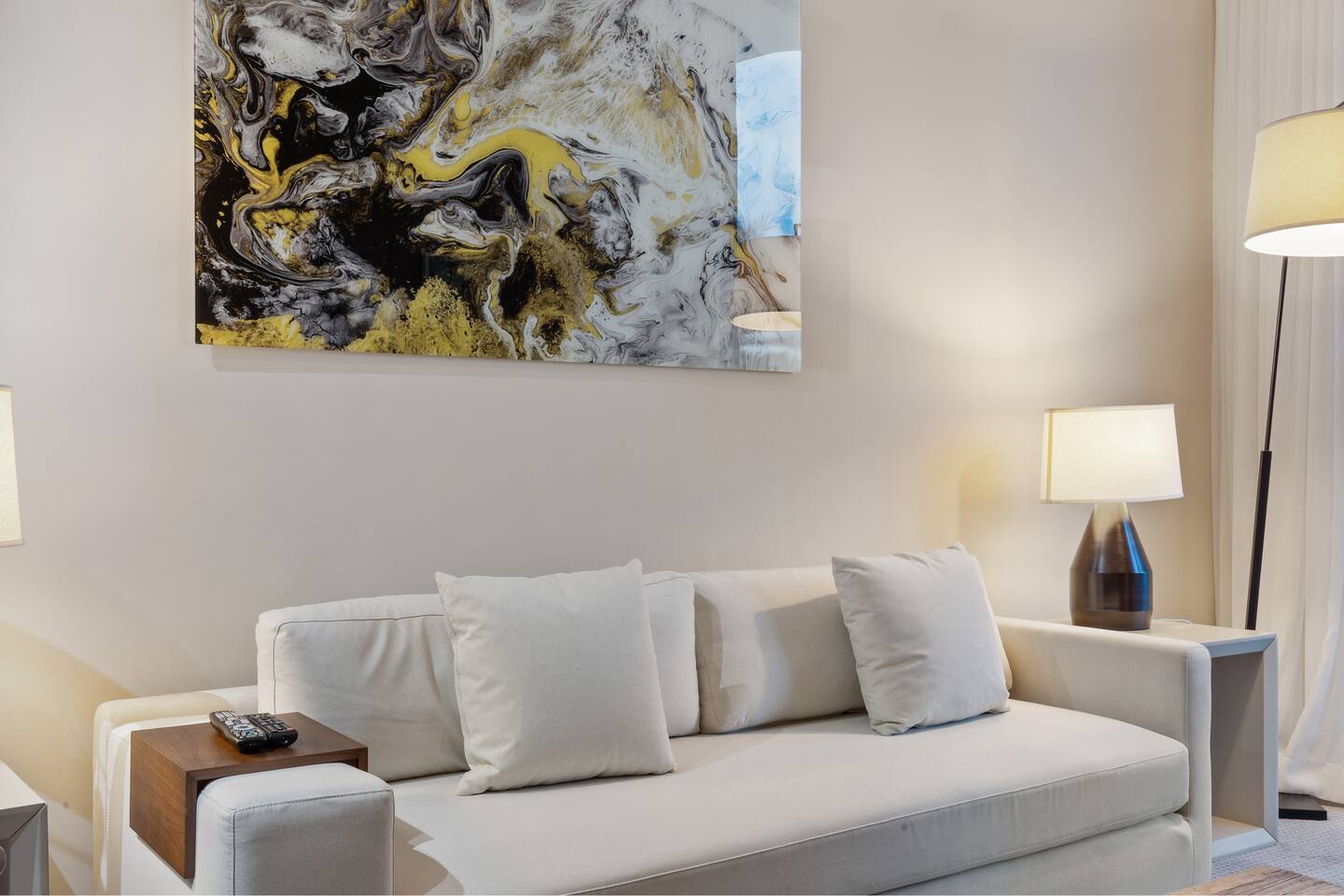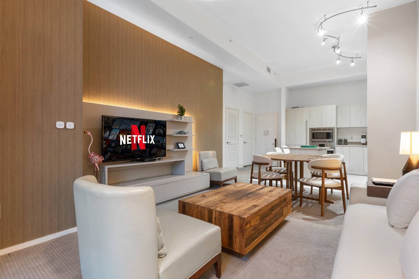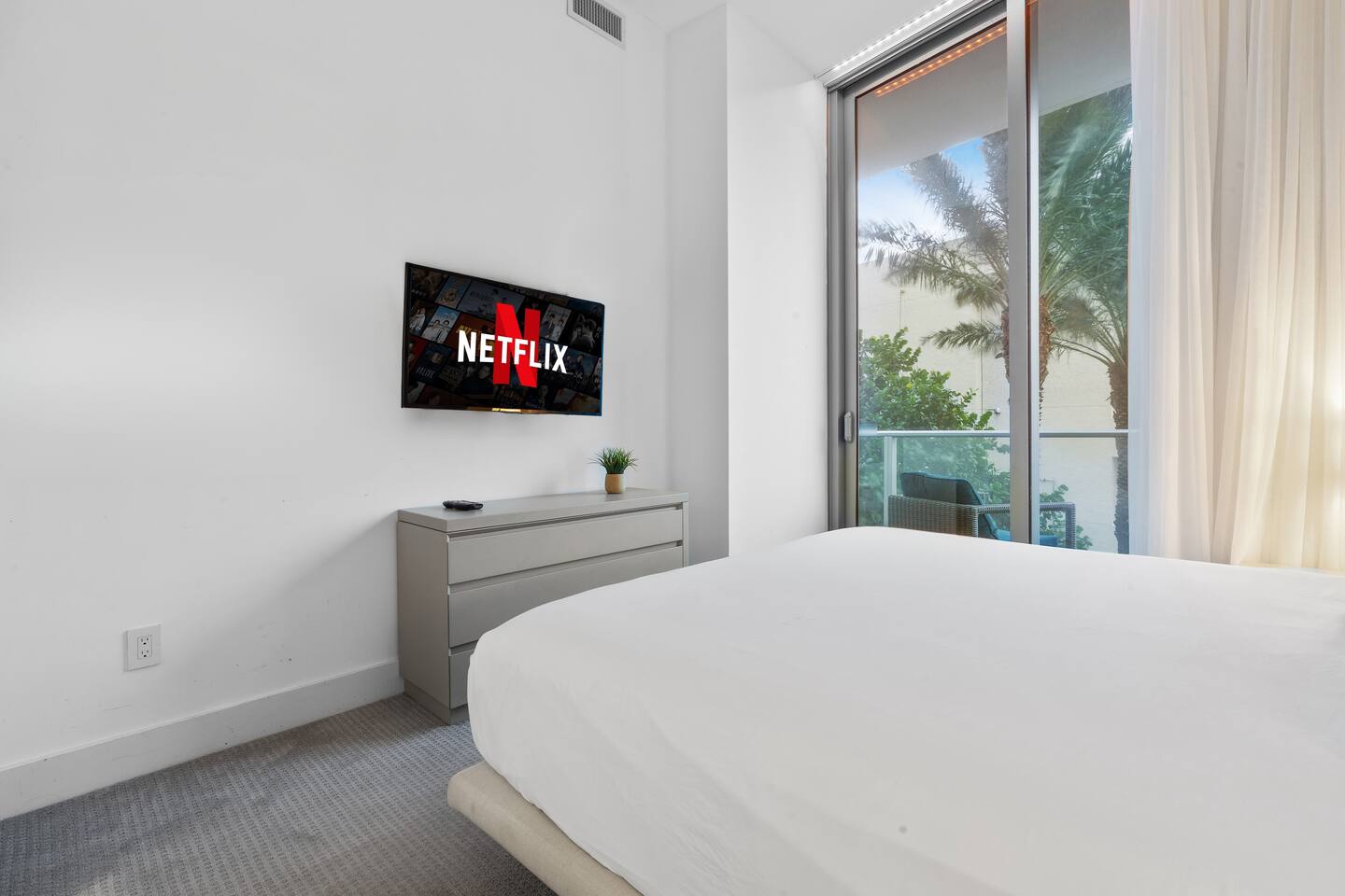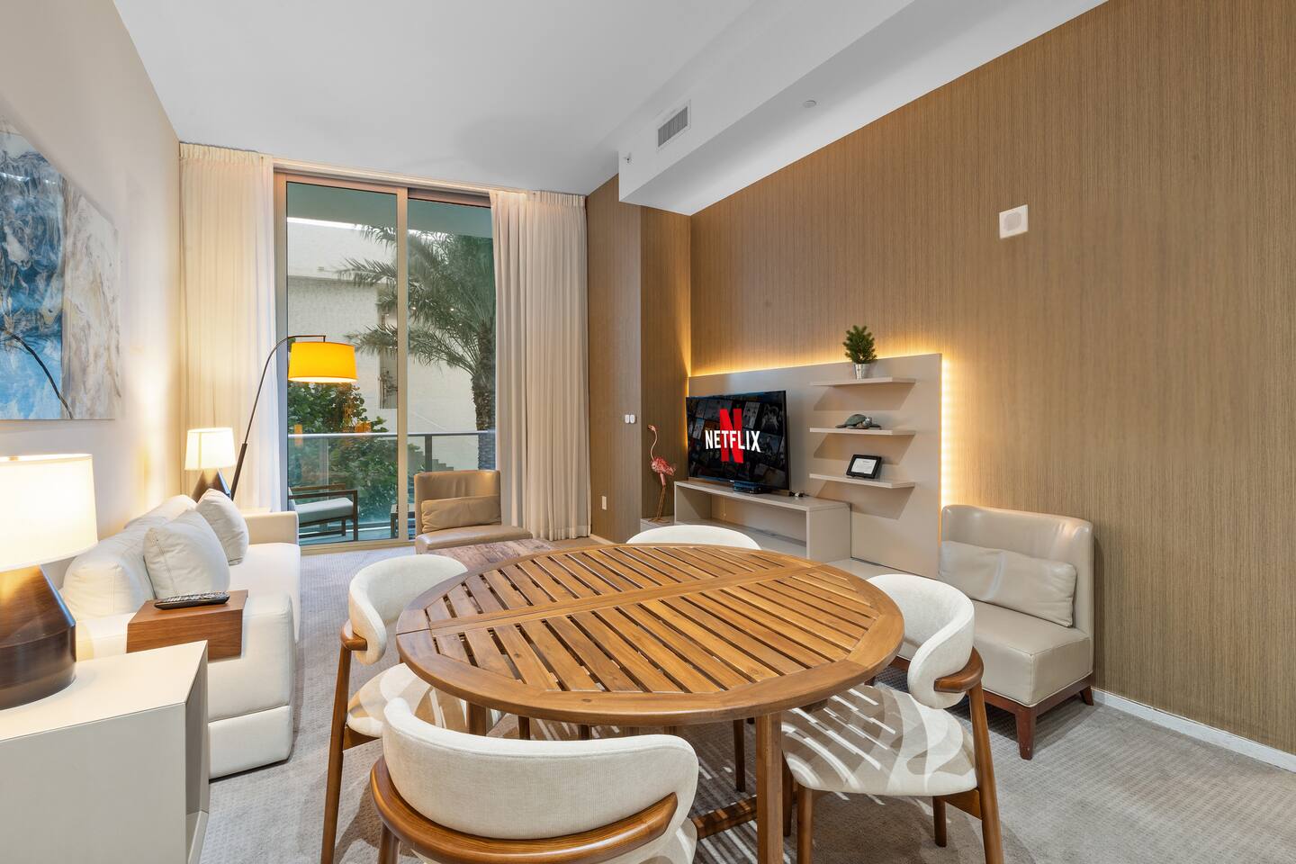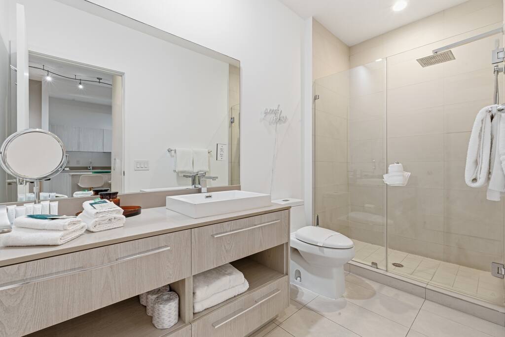 🏝️We welcome you to pamper yourself with an extraordinary vacation at one of the most lavish resorts, where we fulfill your cravings for opulence. This destination is ideal for groups of friends and families in search of an elegant Florida retreat. Additionally, the space caters to individuals yearning for a romantic escape with their beloved companions. ⸻ 🛋️ Living Room: Relax in the bright and modern living room, where a stylish sofa easily transforms into a full-size bed and two armchairs invite you to unwind. Watch your favorite shows on the flat-screen TV or gather at the dining table for four. Sliding glass doors lead to a private balcony, bringing in fresh light and outdoor views. ⸻ 🥂Dining Area: The dining area offers a modern round table with comfortable seating for four, creating the perfect spot for shared meals, conversations, or working while enjoying the natural light from the balcony. ⸻ 🍳 Kitchen: The kitchen is thoughtfully designed for both convenience and style, featuring sleek modern appliances, ample cabinetry, and all essential cookware to prepare meals with ease. A spacious island with seating for two creates the perfect spot to enjoy coffee, casual bites, or good conversation. With the added benefit of an in-unit washer and dryer, this space combines functionality and comfort to make your stay effortless. ⸻ 🛏️ Bedroom: The bedroom features a plush king-size bed dressed in high-quality linens, creating a restful retreat after a day of sun and exploration. Step onto your private balcony for fresh air and relaxation, or unwind indoors with the HD TV. A foldable single bed stored in the closet offers flexibility for extra guests. For added convenience, a designated bathroom is located right next to the bedroom. A perfect balance of comfort and elegance awaits. ⸻ 🛁 Bathroom: The bathroom offers a sleek, modern design with a spacious walk-in shower, elegant fixtures, and a bright, refreshing atmosphere. Guests will find fresh towels along with complimentary shampoo and conditioner, creating a comfortable and spa-like experience throughout their stay. ⸻ 🌅Private Balcony: The balcony provides a relaxing retreat with comfortable seating, surrounded by palm trees and views of the ocean in the distance. It’s an inviting spot to enjoy fresh air, morning coffee, or a peaceful evening. ⸻ 🧺 Washer/Dryer: In-unit washer and dryer available for your convenience.