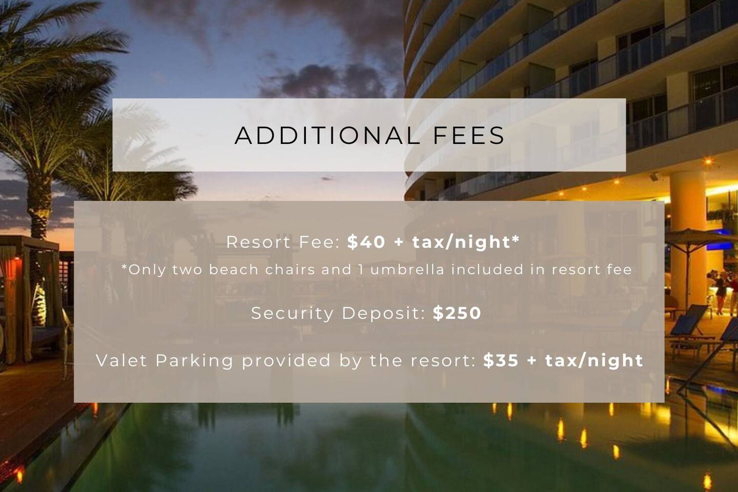 👥 Guest Policy: The unit accommodates up to 3 guests and includes all essentials for a short-term stay. For additional personal items, nearby shops and supermarkets are available. Wristbands provided by the resort must be worn by all guests when using resort amenities. No parties or unregistered guests allowed. ⸻ 🔑 Check-In Method: You will check in with the hotel receptionist. Three days prior to your arrival, you’ll receive all information how to access the property. ⸻ 💳 Resort Fee and Security Deposit: • $250 refundable security deposit held on your credit card, released after check-out (may take 3-5 business days to reflect) • $40 + tax per night, payable at check-in, includes beach service and resort amenities • Credit card and ID must match the reservation or accompanying guest • All guests are required to sign a check-in form upon arrival. • For stays over 30 days, please contact the resort for current rates, fees, and amenity details. ✅ Paid directly to the resort at check-in. ⸻ 🔞 Age Requirement: All guests must be 21 or older to book and check in. ⸻ 🅿️ Valet Parking & EV Charging: Valet-only parking is available. • $35 + tax per night (1–7 days) • $30 + tax per night (8+ days) 💲 Paid separately. EV charging available on-site. ⸻ 🍼 Pack 'n Play / Travel Crib: A Pack 'n Play (travel crib) is available upon request for an additional fee of $100. Please let us know at least one week before your arrival if you’d like it prepared for your stay. 💲You will be able to purchase this option through our guest portal. ⸻ 🧳 Early Check-In: Early check-in is not guaranteed, but we’ll do our best to accommodate if possible. The cost is $80 - as early as available (must be confirmed with our customer service). 💲You will be able to purchase this option through our guest portal. ⸻ 🕐 Late Check-Out: Need a little more time? If available, we offer 2 extra hours for $80. Must be requested at least 1 day prior to check-out. 💲You will be able to purchase this option through our guest portal. ⸻ 🧼 Housekeeping During Stay: Optional housekeeping is available for $128. Service provided by a third-party cleaning company. 📞 Contact us to schedule. ⸻ 📦 Package Delivery: • Package Pickup Hours: 8:00 AM to 4:00 PM ($5.50 fee) • After Hours: $27.50 fee 🙌 Please bring a valid ID to claim your package. Guests will only be charged the package fee if the delivery is not addressed to the reservation holder. ⸻ 🧴 Optional Add-Ons: • Set of Towels: $25 • Linen Package: $35 • Basic Toiletries: $20 • Essentials Pack: $35 (includes toilet paper, garbage bags, paper towels, dishwasher liquid, and detergent) 📞 Contact us to arrange. ⸻ 🚭 Smoking Policy: Smoking is not allowed inside the unit or on balconies. A $500 fine applies for any violation. ⸻ 🪟 Doors & Windows: Please keep doors and windows closed to maintain A/C efficiency and prevent humidity damage. ⸻ 🐜 Local Environment: Florida’s tropical climate may attract insects. The unit is professionally treated, but we recommend keeping doors closed to reduce exposure. ⸻ 💖Thank you for booking with us. We look forward to hosting your stay in South Florida!