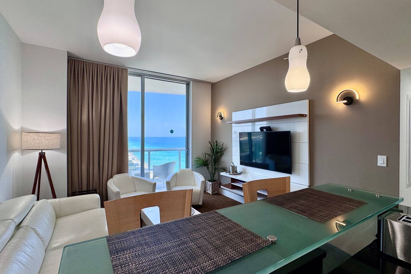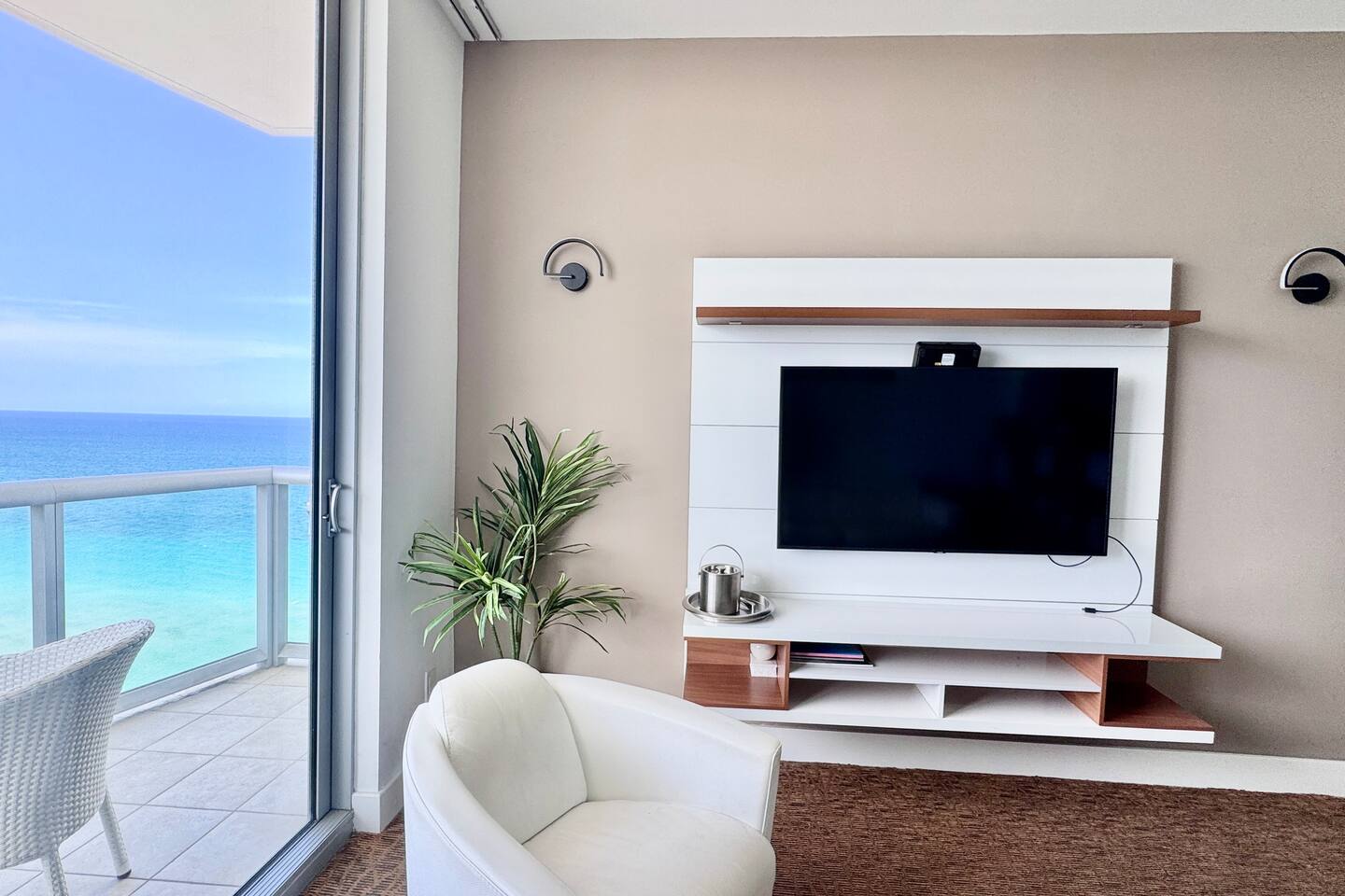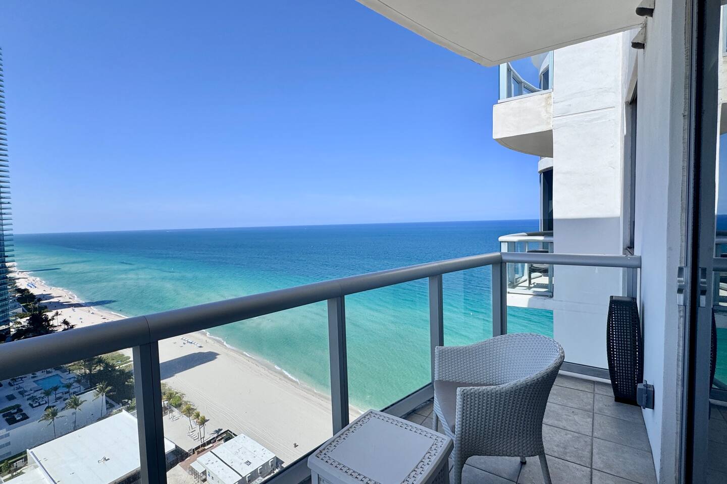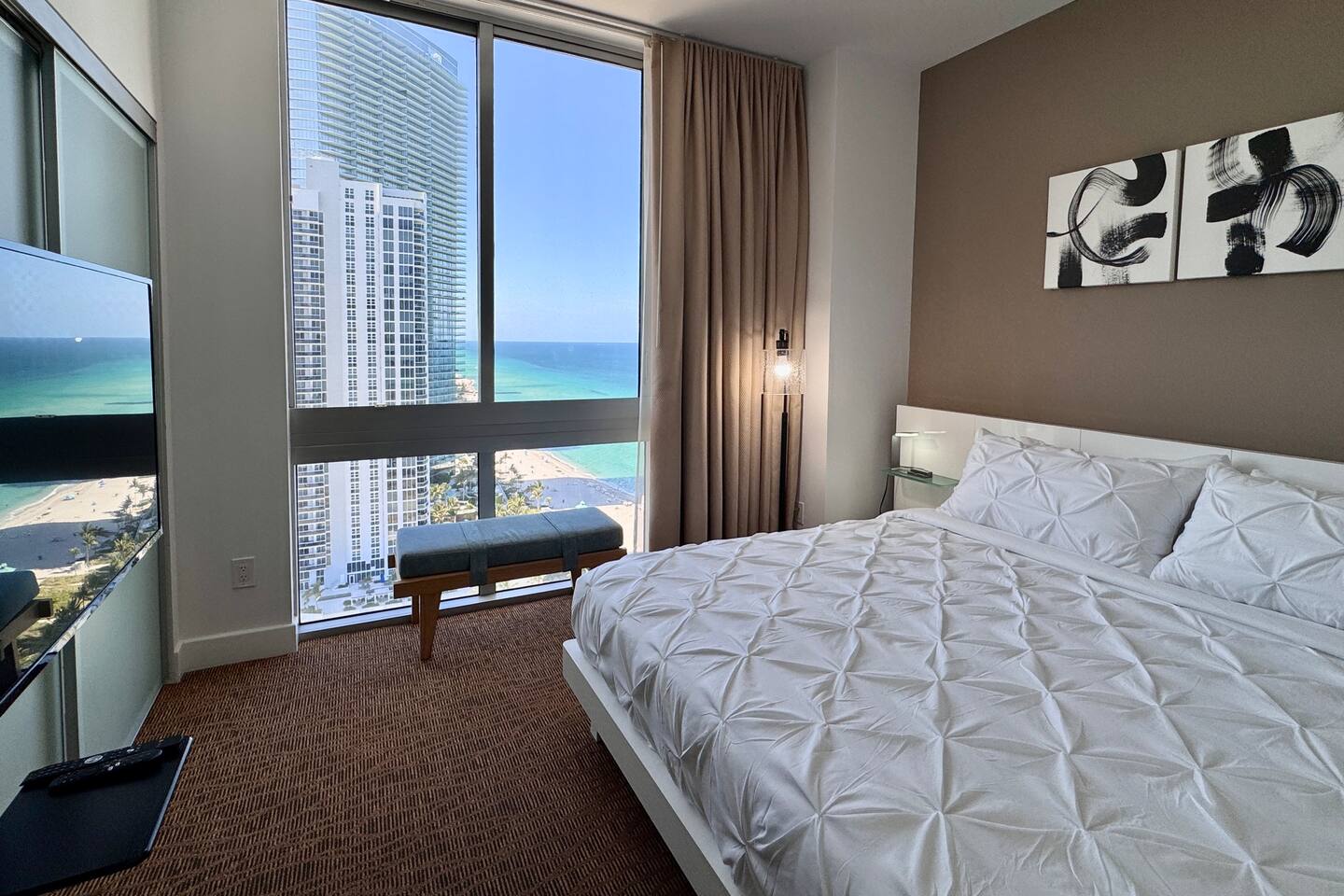 🍳 Kitchen & Dining: The sleek open kitchen features stainless steel appliances, modern cabinetry, and everything you need to prepare snacks or light meals. A bar-style table for two creates the perfect setting for casual breakfasts or evening wine. ⸻ 🛋️ Living Room: The spacious high celling living area offers a cozy sofa, huge flat-screen TV, and wall-to-wall windows that frame sweeping views of the Atlantic Ocean. Whether you’re lounging with a book or catching a show, the ocean is always in sight. Step directly onto your private balcony to take it all in. ⸻ 🛏️ Bedroom: Drift off and wake up to stunning ocean views right from your bedroom. This tranquil space includes premium linens, a flat-screen TV, and ample closet space for extended stays. ⸻ 🛁 Bathroom: The spa-style bathroom is located just outside the bedroom and includes a soaking tub, sleek vanity, bright lighting, and modern finishes, perfect for getting ready or winding down. ⸻ 🌇 Private Balcony: Step outside to your oceanfront balcony with comfortable seating and breathtaking, unobstructed views of the Atlantic Ocean and City Skyline. It’s your front-row seat to sunrise coffees and sunset sips. ⸻ 🧺 Washer & Dryer: Enjoy the convenience of a private in-unit washer and dryer - perfect for extended stays or freshening up after a beach day.