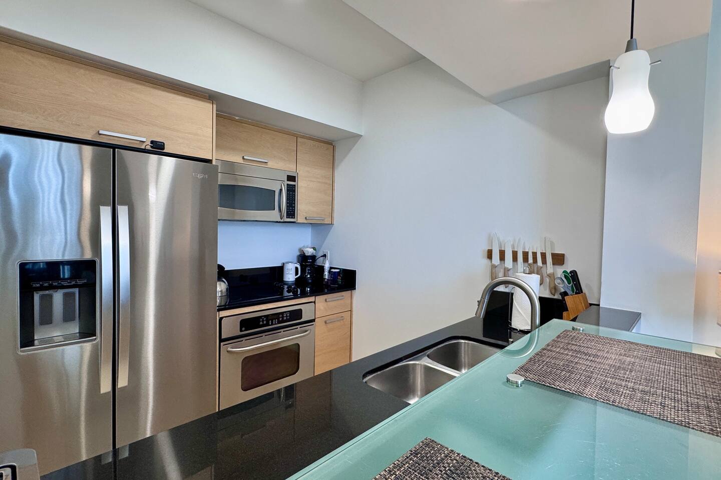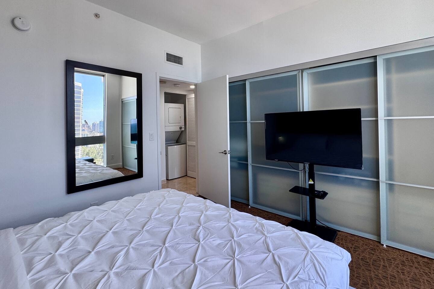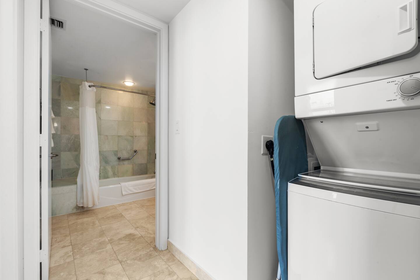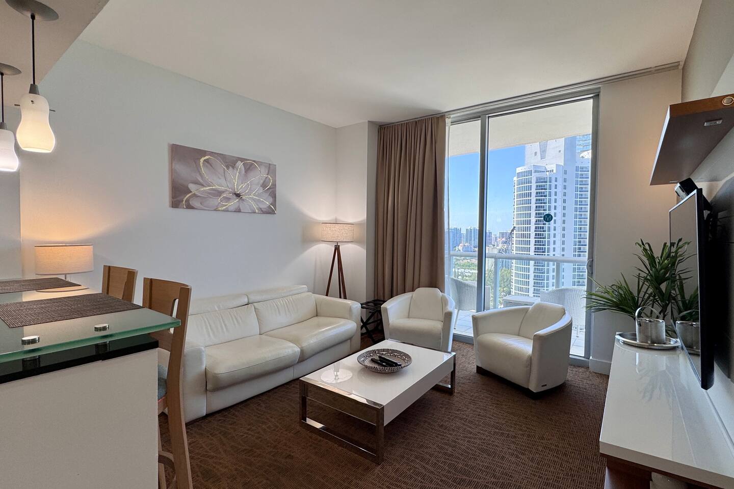 🍳 Kitchen & Dining: The sleek open kitchen features stainless steel appliances, modern cabinetry, and everything you need to prepare snacks or light meals. A bar-style table for two creates the perfect setting for casual breakfasts or evening wine. ⸻ 🛋️ Living Room: The spacious high celling living area offers a cozy sofa, huge flat-screen TV, and wall-to-wall windows that frame sweeping views of the Atlantic Ocean. Whether you’re lounging with a book or catching a show, the ocean is always in sight. Step directly onto your private balcony to take it all in. ⸻ 🛏️ Bedroom: Drift off and wake up to stunning ocean views right from your bedroom. This tranquil space includes premium linens, a flat-screen TV, and ample closet space for extended stays. ⸻ 🛁 Bathroom: The spa-style bathroom is located just outside the bedroom and includes a soaking tub, sleek vanity, bright lighting, and modern finishes, perfect for getting ready or winding down. ⸻ 🌇 Private Balcony: Step outside to your oceanfront balcony with comfortable seating and breathtaking, unobstructed views of the Atlantic Ocean and City Skyline. It’s your front-row seat to sunrise coffees and sunset sips. ⸻ 🧺 Washer & Dryer: Enjoy the convenience of a private in-unit washer and dryer - perfect for extended stays or freshening up after a beach day.