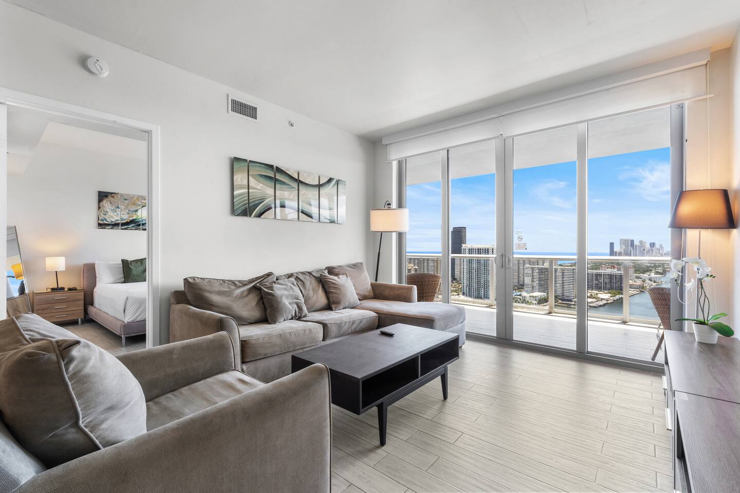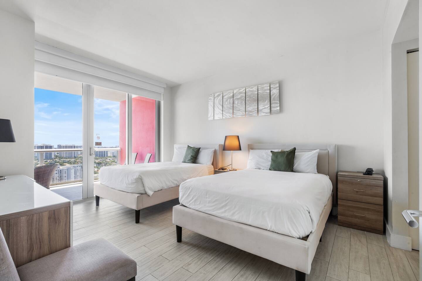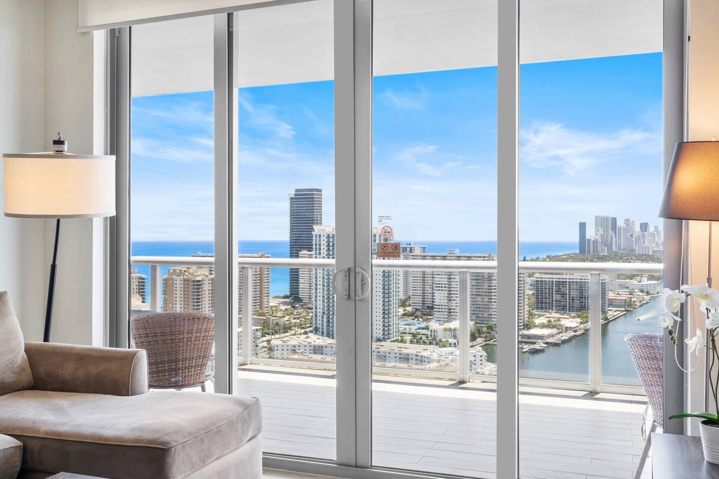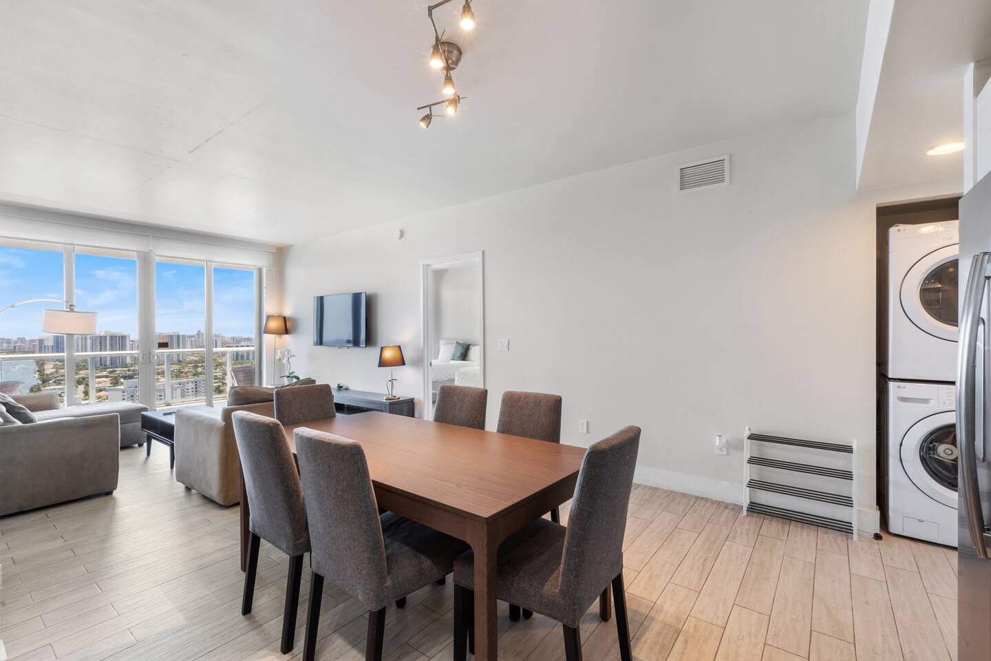 🏝️Located in the heart of South Florida, this penthouse is just a short stroll from the sandy shoreline and close to Gulfstream Park, Aventura Mall, Sunny Isles, and Hollywood Beach. Enjoy a variety of nearby restaurants, bars, and beachside cafés, with easy highway access to Miami’s glamour, Wynwood’s art scene, and Fort Lauderdale. Whether you’re here to relax, explore, or work remotely, this penthouse is the perfect base for your South Florida getaway. ⸻ 🍳 Kitchen: The kitchen is fully equipped with sleek, modern appliances, including a coffee maker and dishwasher for added convenience. Whether you’re starting your day with a fresh brew or cooking a delicious dinner, this stylish space is ready for all your culinary moments. ⸻ 🥂Dining Area: The dining area offers a welcoming space to gather, featuring a sleek table with comfortable seating for six. Whether you’re enjoying a casual breakfast or a special dinner, the open layout keeps you connected to the kitchen, living room, and beautiful views beyond. ⸻ 🛋️Living Room: The living room is a bright and inviting space with large windows that frame stunning water and city views. A plush, comfortable sofa doubles as an extra sleeping space for added flexibility, while a flat-screen TV offers entertainment after a day of exploring. Warm lighting and modern design create a cozy atmosphere you’ll love spending time in. ⸻ 🛏️Master Bedroom(Intercostal/city, side ocean-view): The master bedroom is your private retreat, featuring a king-size bed with plush bedding, abundant natural light, and direct access to the balcony for fresh air and stunning views. Enjoy a dedicated workspace, ample storage for your essentials, and a Smart TV to unwind after a day of adventures. ⸻ 🛏️Second Bedroom(Intercostal/city, side ocean-view): The second bedroom is perfect for families, kids, or friends sharing, featuring two comfortable double beds with fresh linens and fluffy pillows. A bright, cheerful atmosphere and a Smart TV make it ideal for relaxing movie nights or morning cartoons. ⸻ 🛁Master Bathroom: The master bathroom is a private en-suite designed for comfort and style, featuring a walk-in shower with sleek fixtures, bright lighting, and a large mirror. Enjoy soft towels and premium toiletries in a fresh, modern space that keeps you feeling refreshed throughout your stay. ⸻ 🛁Second Bathroom: The second bathroom, located within the second bedroom, features a clean, modern design with a walk-in shower, fresh towels, and all the essentials provided. Convenient and stylish, it offers guests comfort and privacy during their stay. ⸻ 🌅Balcony: The balcony is your private outdoor escape, offering incredible ocean, Intracoastal, and city views. With a spacious layout, comfortable seating, and a dining area perfect for meals or evening drinks, it’s the ideal spot to relax and soak in the Miami vibes any time of day. ⸻ 🧺 Washer/Dryer: In-unit washer and dryer available for your convenience.